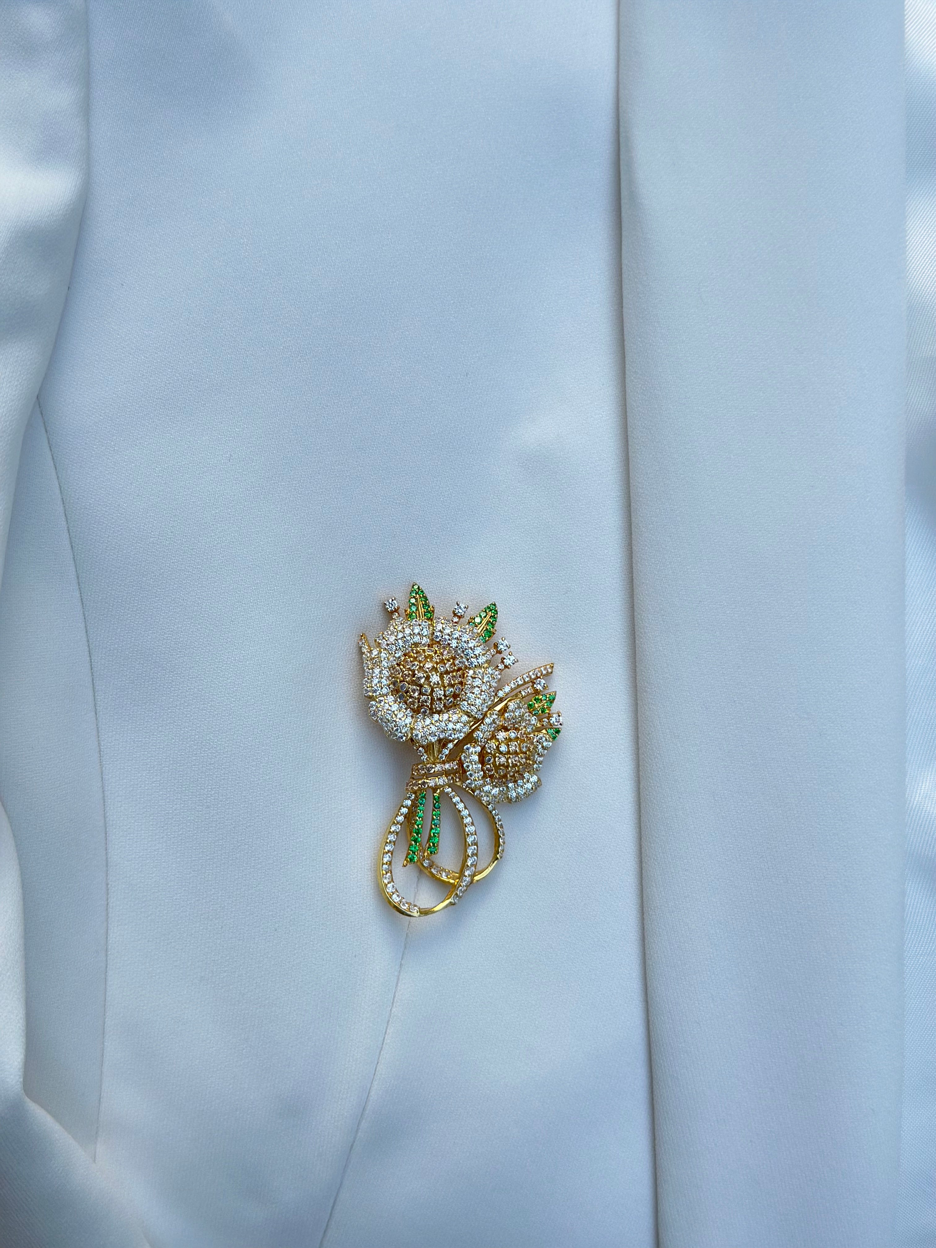 Experience timeless elegance with this Victorian Finish Brooch, meticulously crafted in hallmarked 92.5 fine silver and finished with radiant gold plating. Adorned with sparkling Moissanite Polkis, shimmering Swarovski cz, and rich Green Onyx gemstones, this exquisite brooch measures 4 cm by 5 cm, offering a perfect blend of vintage charm and modern sophistication.