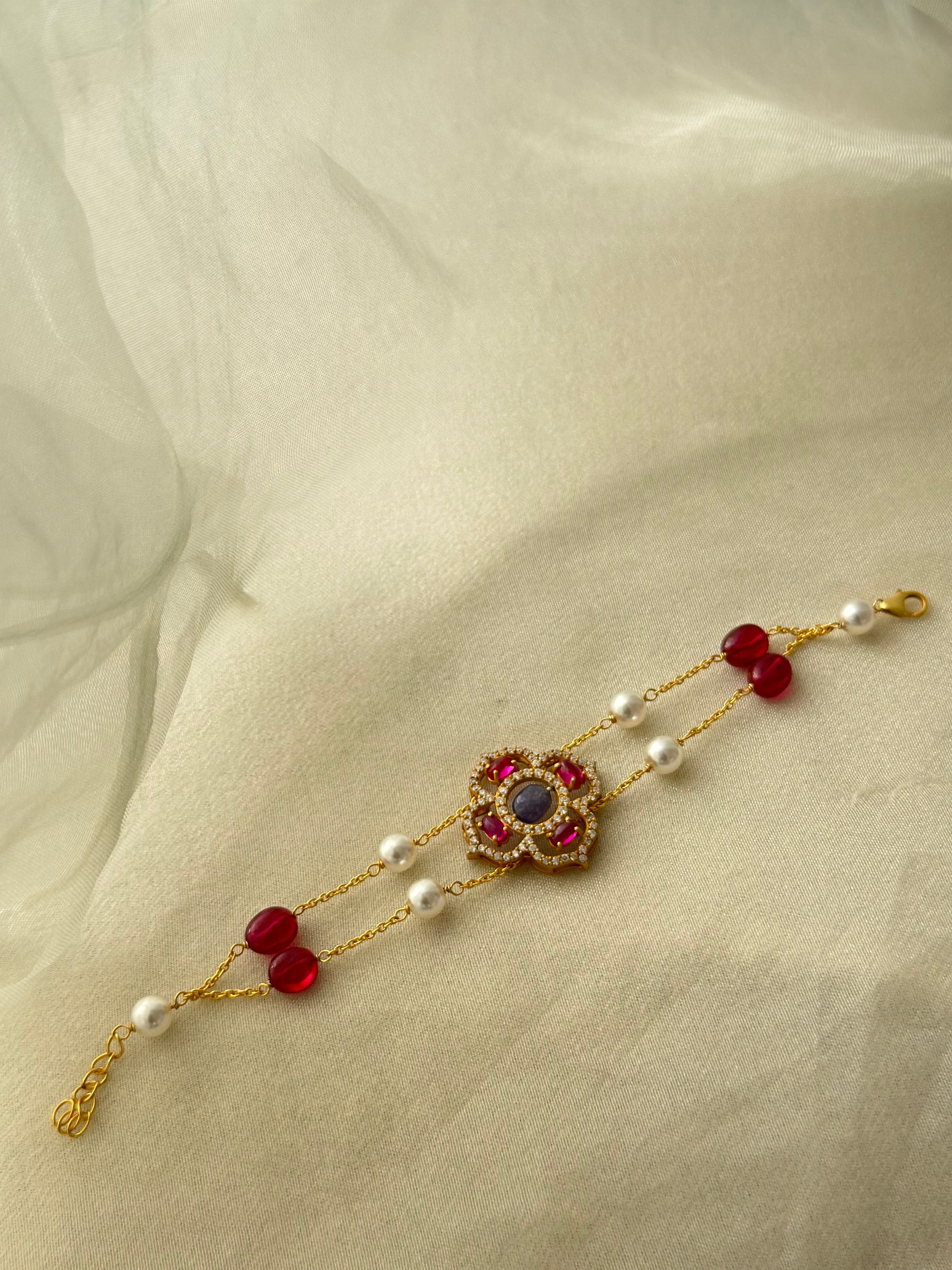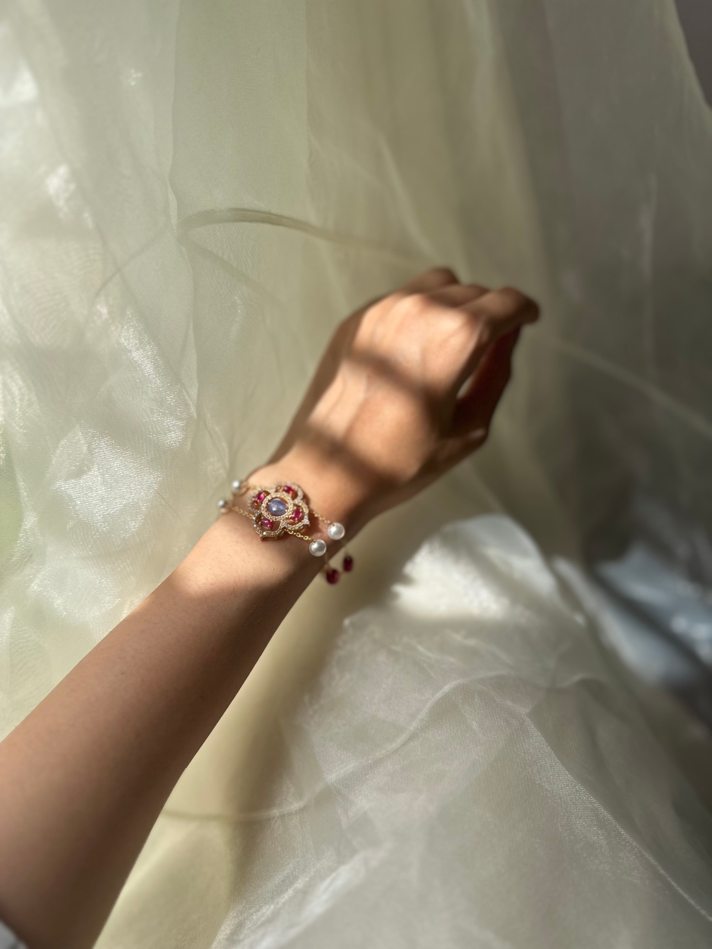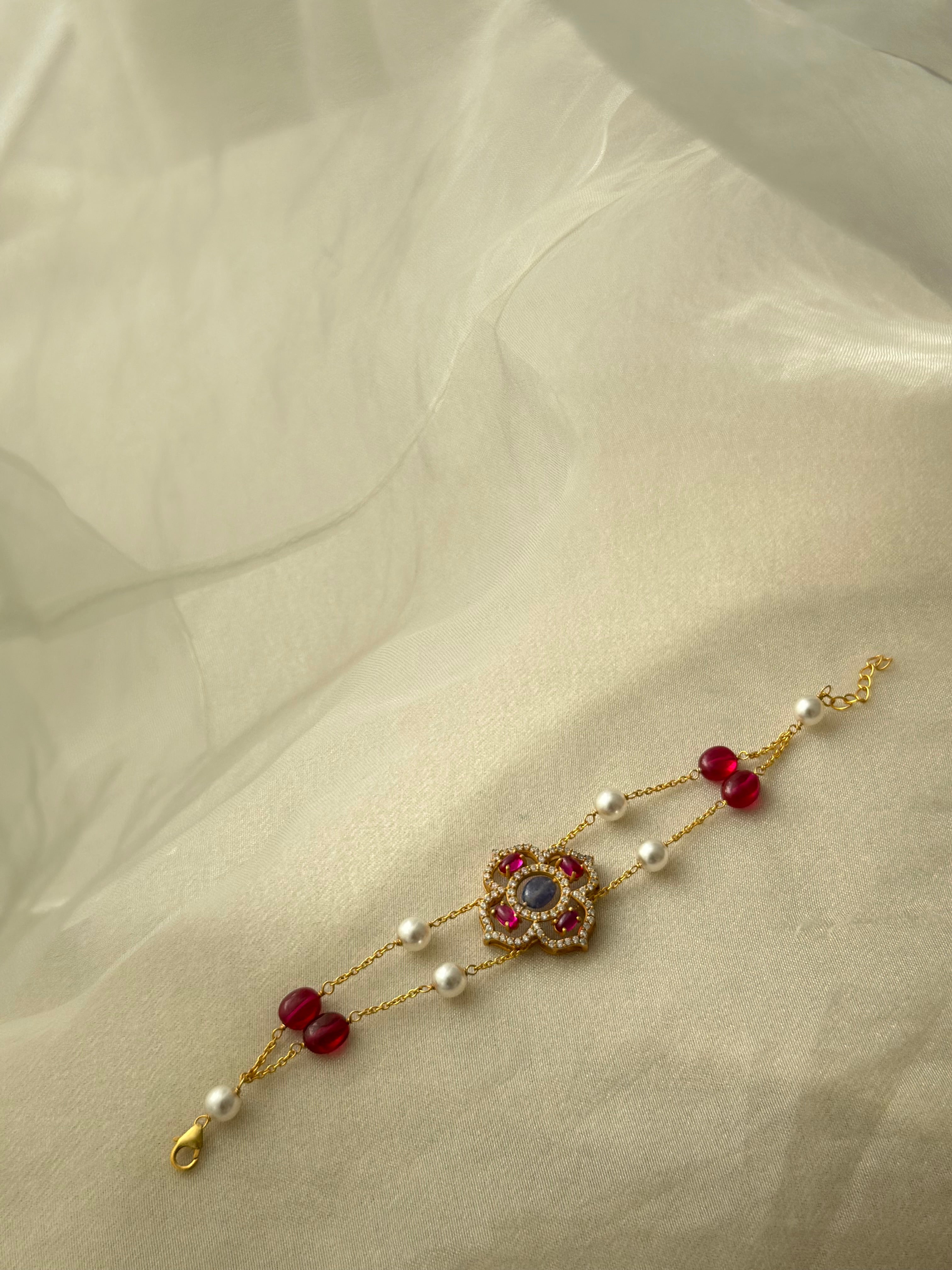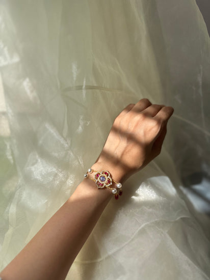 Elevate your wrist game with this luxurious 92.5% fine silver bracelet, gold-plated and hallmarked for authenticity. Featuring a 1-inch delicate element, this adjustable 6-inch + 1-inch bracelet is adorned with natural Tanzanite, Rubies, Moissanite Polkis, Swarovski CZs, and Freshwater Pearls, creating a perfect balance of sparkle and sophistication.