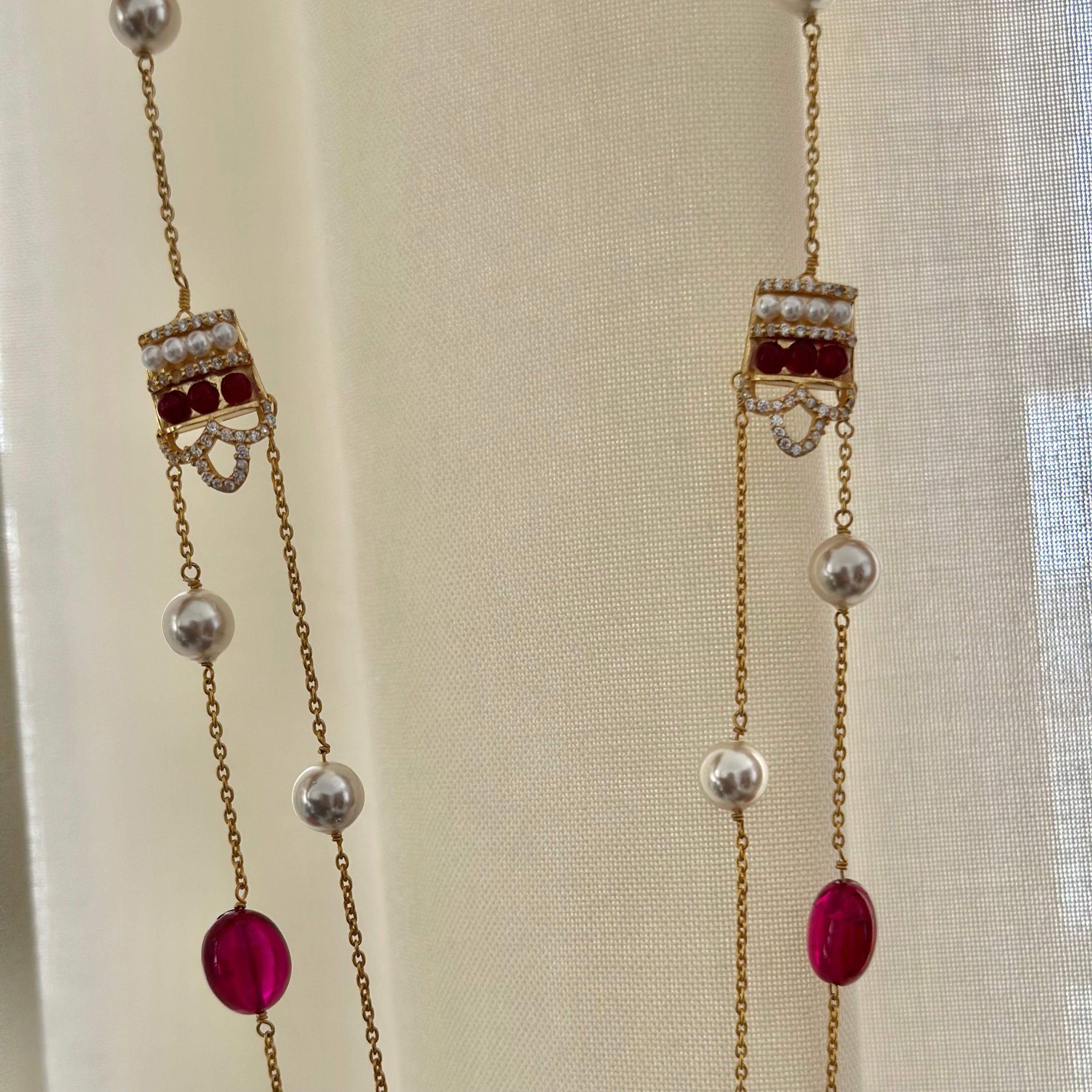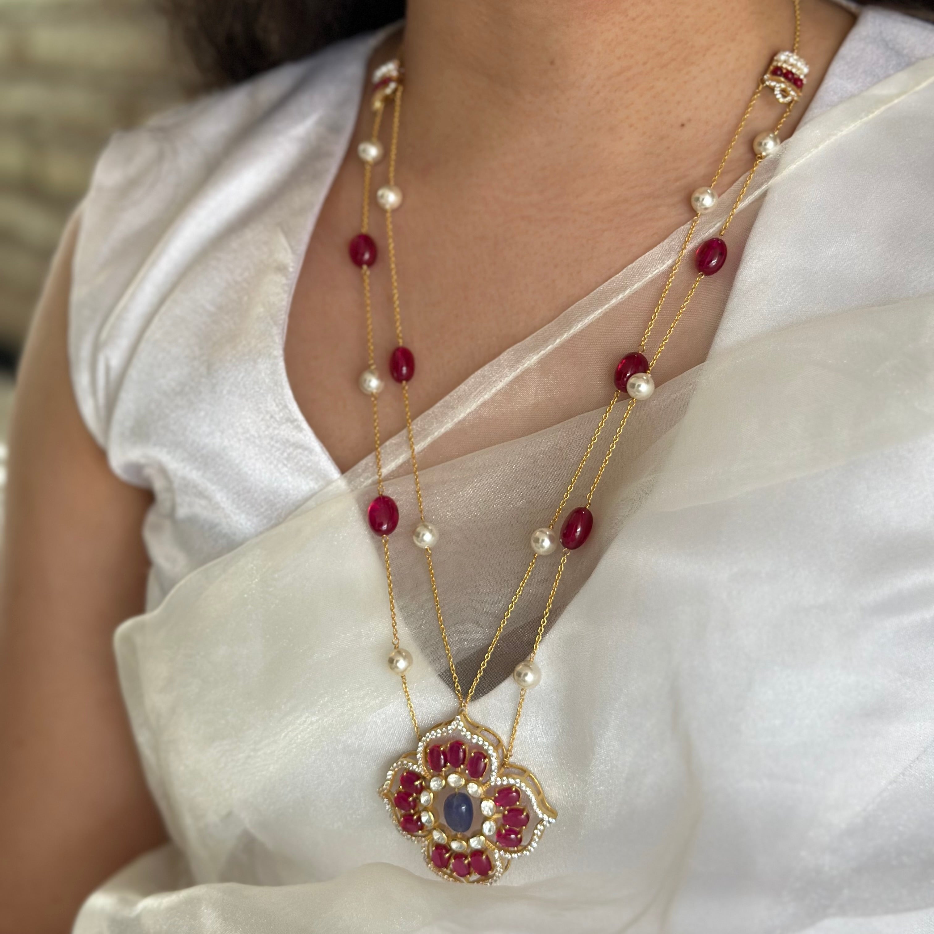 Adorned with natural Tanzanite, vivid Rubies, Moissanite Polkis, Swarovski CZs, and lustrous freshwater pearls, this piece exudes royal sophistication while remaining grounded in modern versatility. Whether worn for a wedding celebration, festive occasion, or as part of a luxury heirloom collection, the Anokhi commands attention with quiet power and undeniable grace.