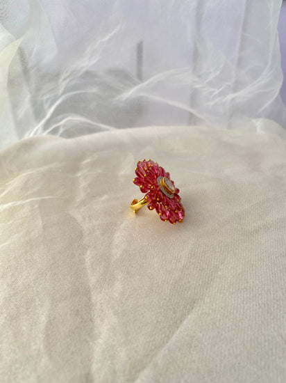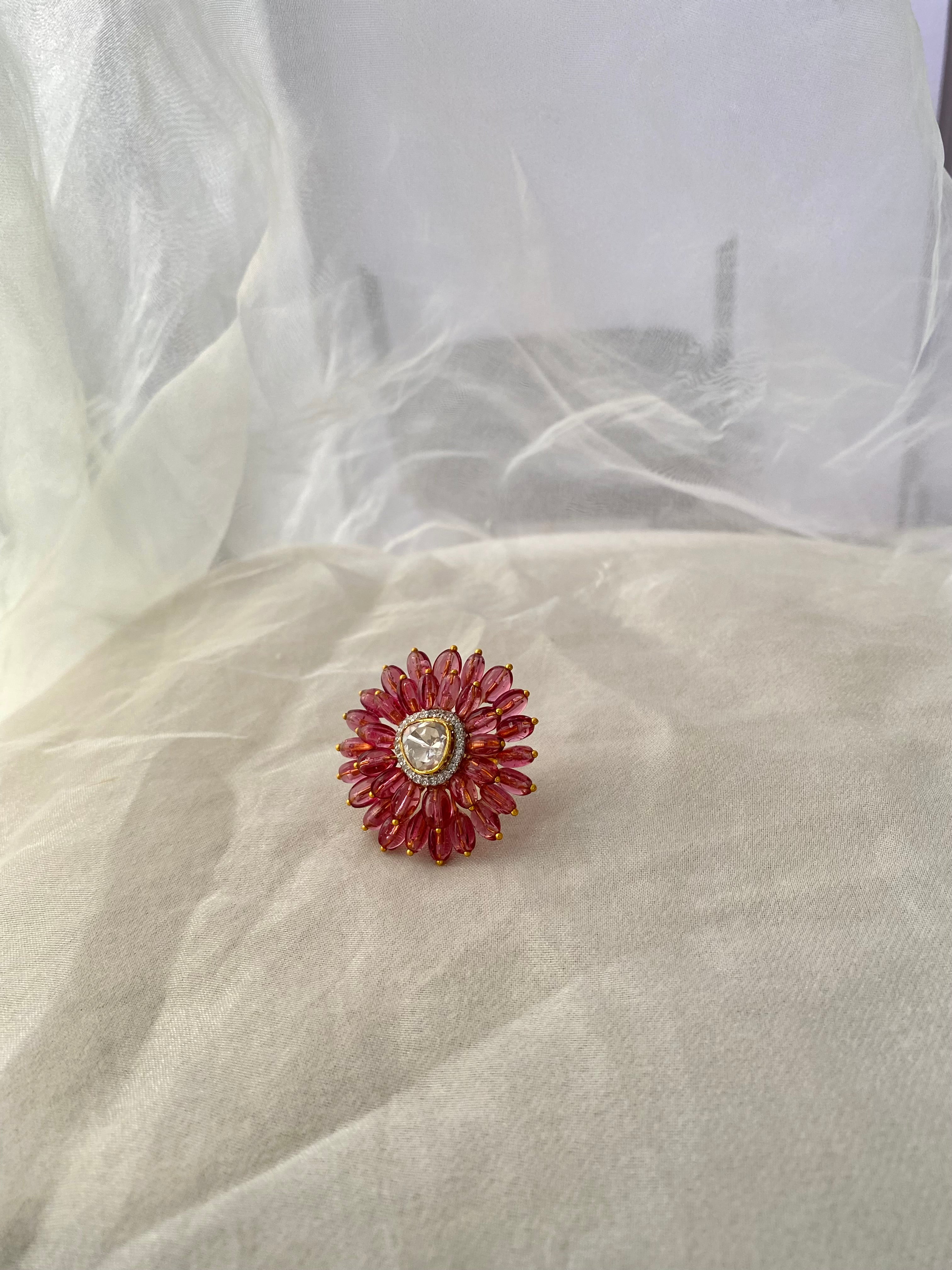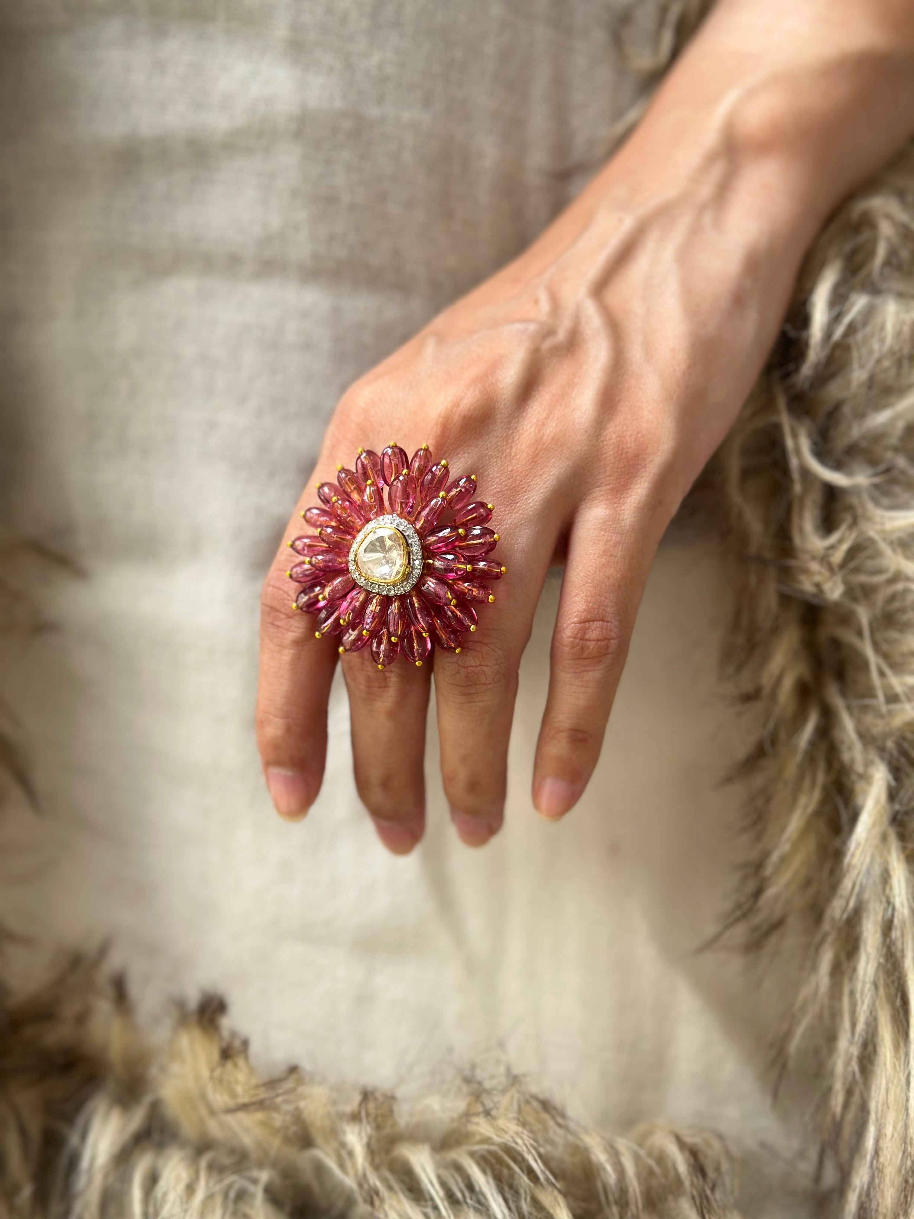 Adorned with a striking mix of high-grade Moissanites, premium Swarovski crystals, and vibrant rubellite gemstones, the ring delivers exceptional sparkle and depth from every angle. The generous 4 cm diameter makes it a true statement ring, perfect for elevating both everyday outfits and special occasions.