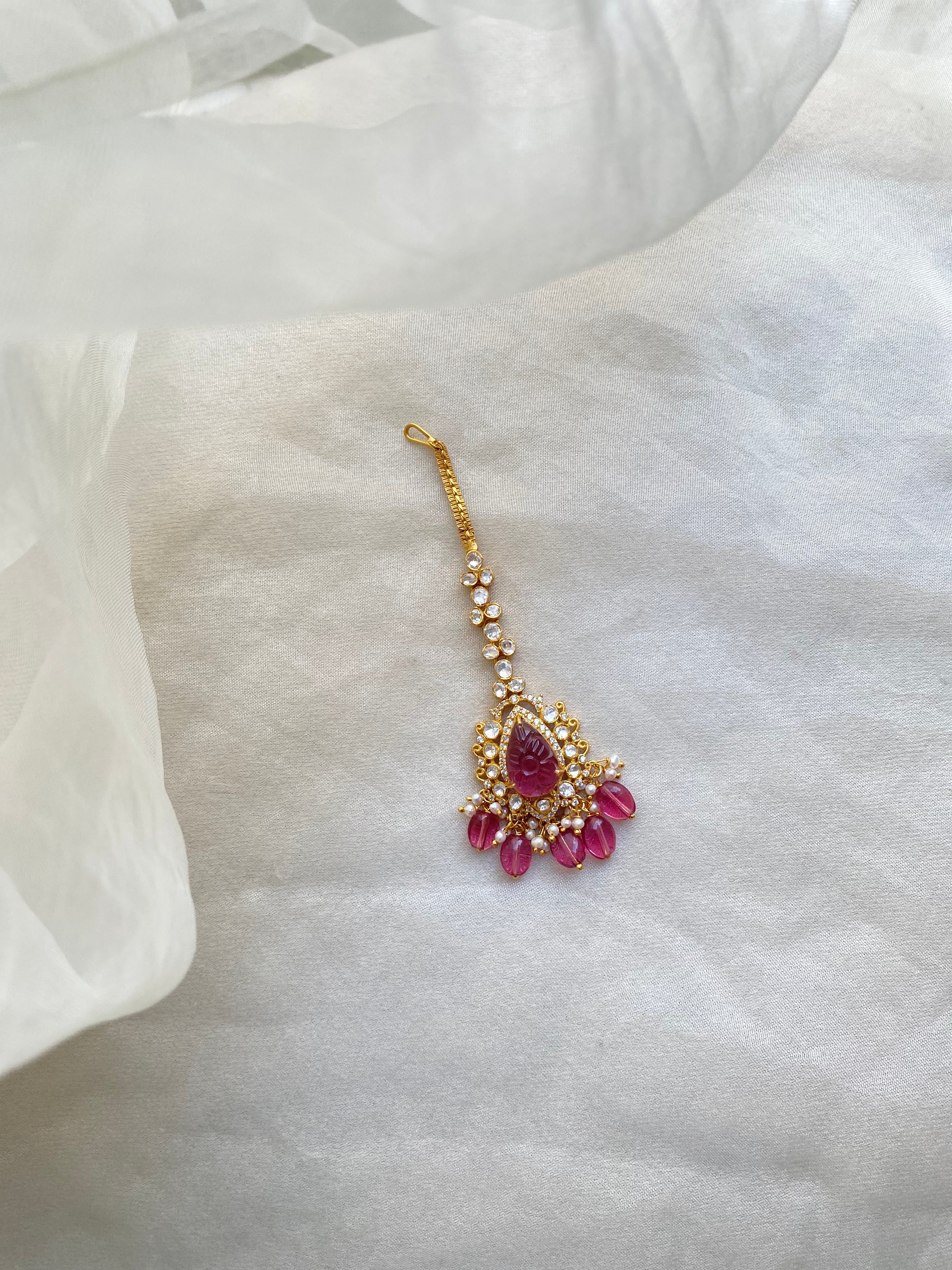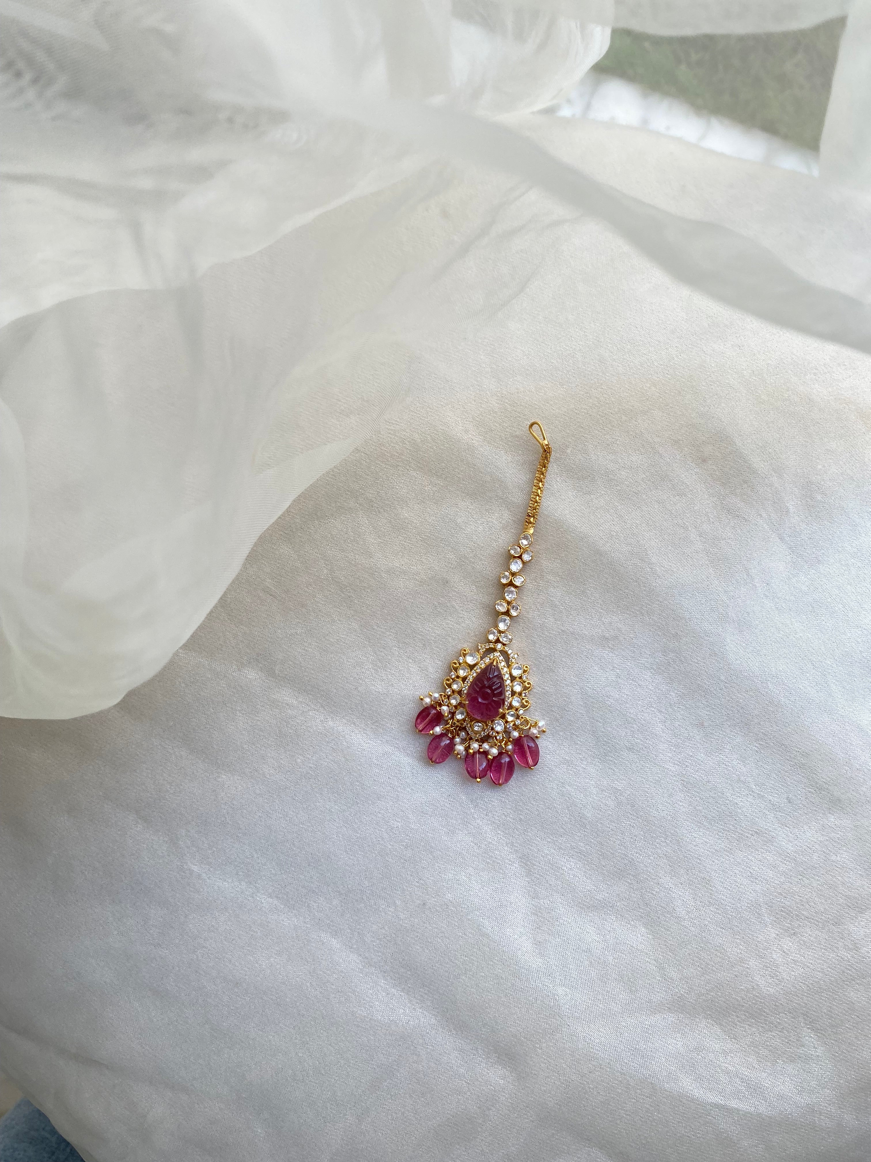 An ode to timeless bridal luxury — this statement Maangtikka is exquisitely handcrafted in 92.5 Fine Silver (Hallmarked) and gold-plated for a royal finish. Featuring a brilliant medley of Moissanite Polki, Swarovski stones, and a stunning carved rubelite centerpiece, the design radiates depth, color, and luminous elegance.
