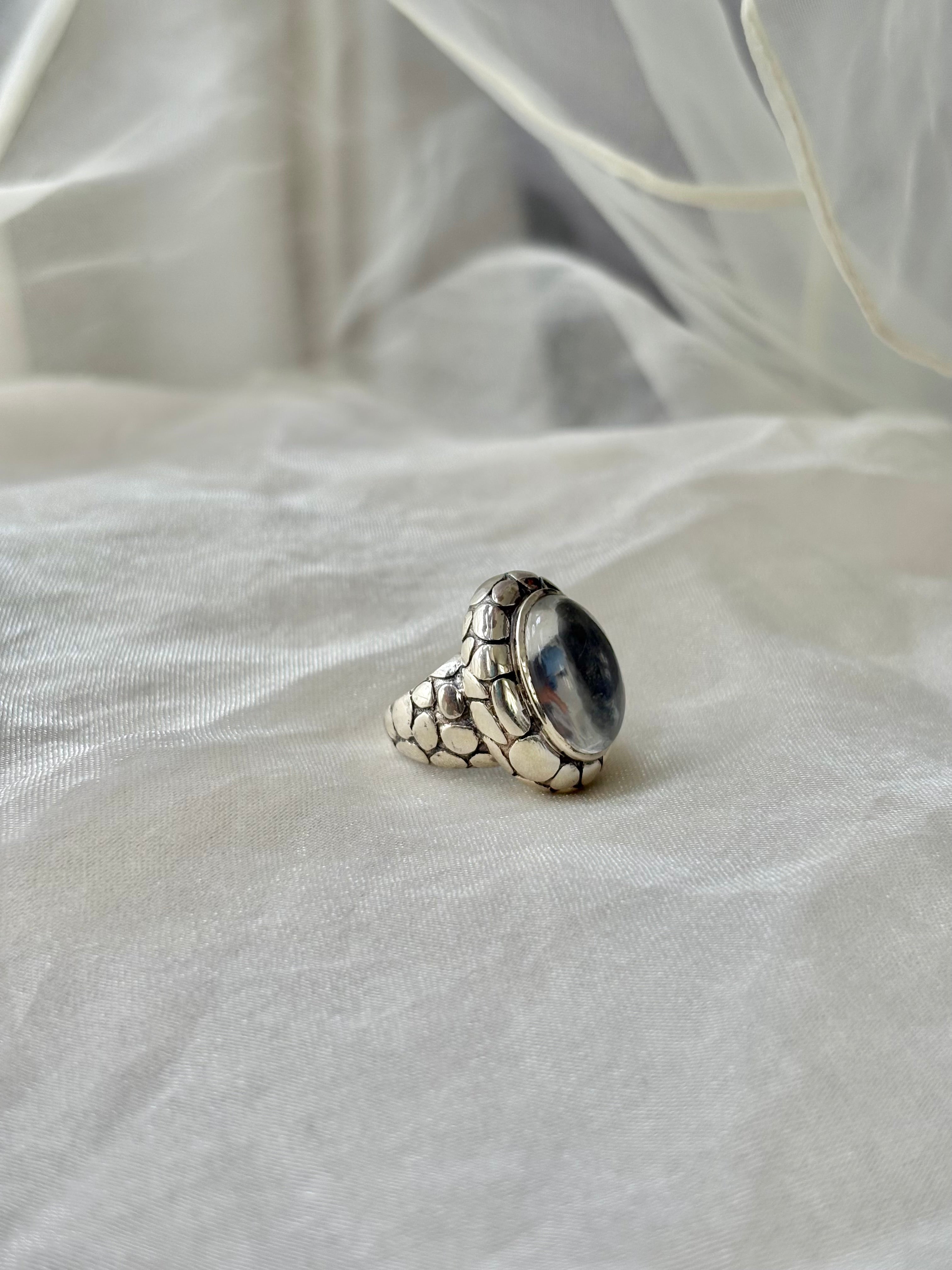 Minimalist, radiant, and versatile — this clear quartz ring is handcrafted in 92.5 hallmarked sterling silver, featuring a luminous 2.5 cm clear quartz element. Designed in Indian size 14, it’s a statement piece that combines modern elegance with timeless charm.