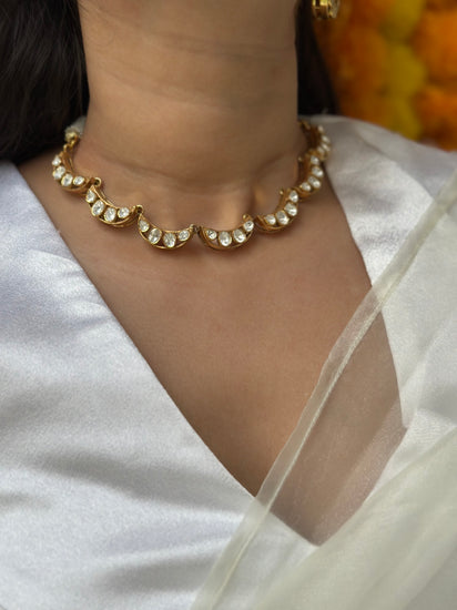 Featuring seven Chaand (moon) motifs in a graceful sequence, this choker embodies heritage artistry with a contemporary edge. Each motif is adorned with brilliant Moissanite Polki gemstones, offering the uncut diamond look with sustainable brilliance. Measuring 6.5 inches in length, it sits beautifully along the neckline, making it an iconic piece for bridal and festive wear.