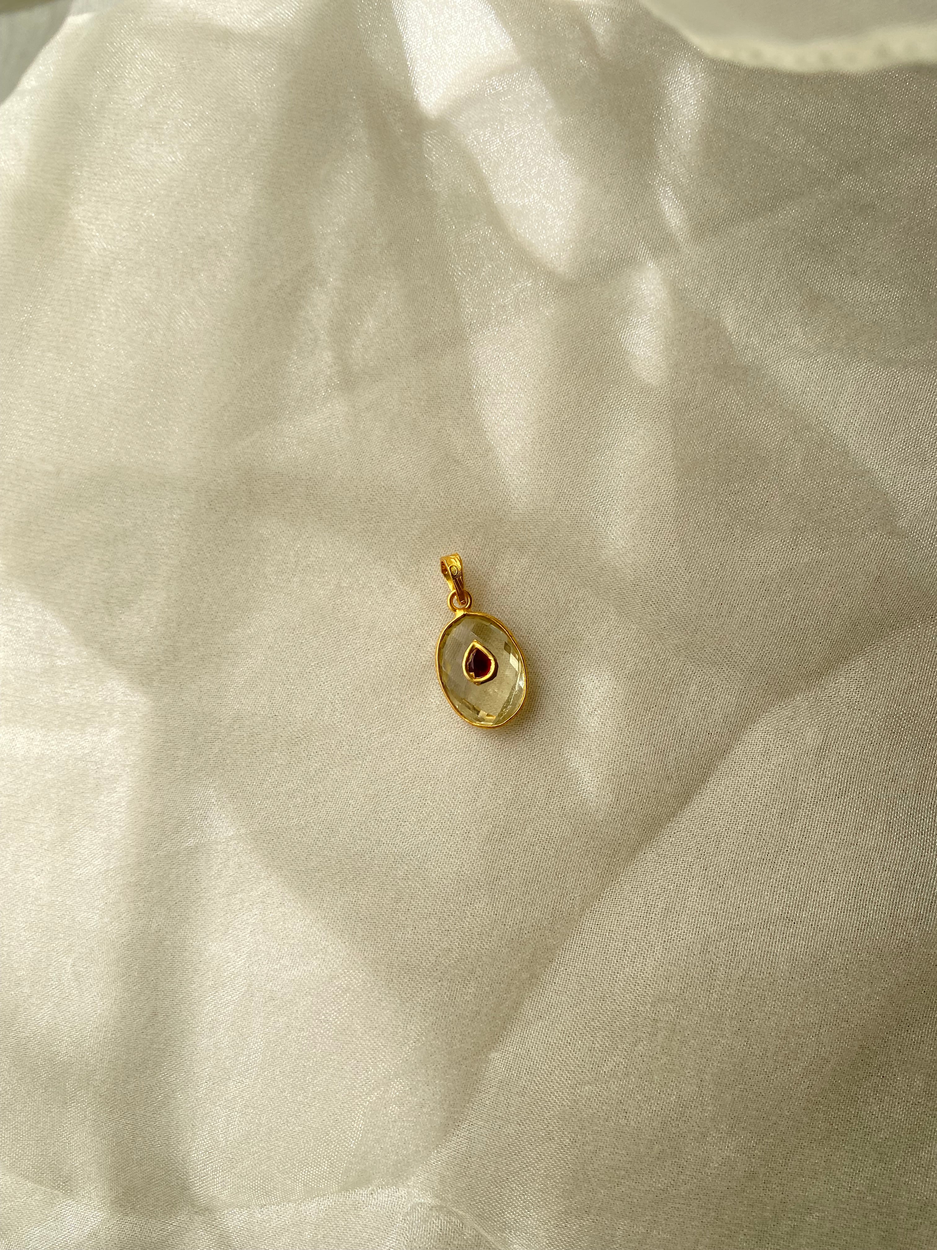 The stunning clear quartz gemstone adds a warm golden glow believed to attract positivity and success, while the red kundan detailing brings a regal touch inspired by traditional Indian artistry. Measuring 3 cm with loop, this pendant perfectly balances sophistication and versatility, making it ideal for both modern and ethnic ensembles.