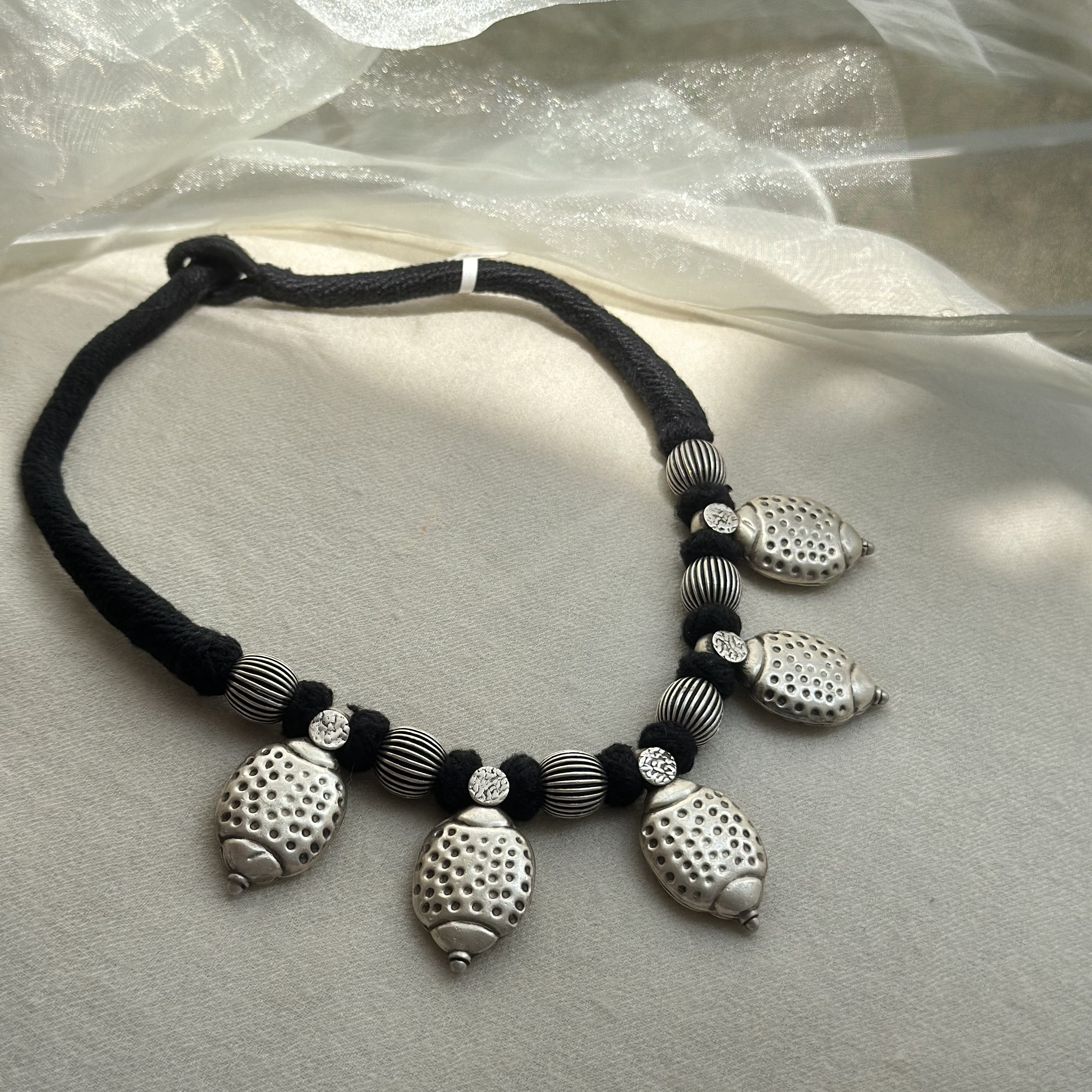 Gracefully handcrafted in hallmarked 92.5 fine silver, this leaf motif necklace captures nature’s purity in its most minimal form. Designed with an attached drawstring closure for an adjustable fit, it adds an effortlessly sacred accent to traditional ensembles—from sarees to kurtas and festive lehengas.