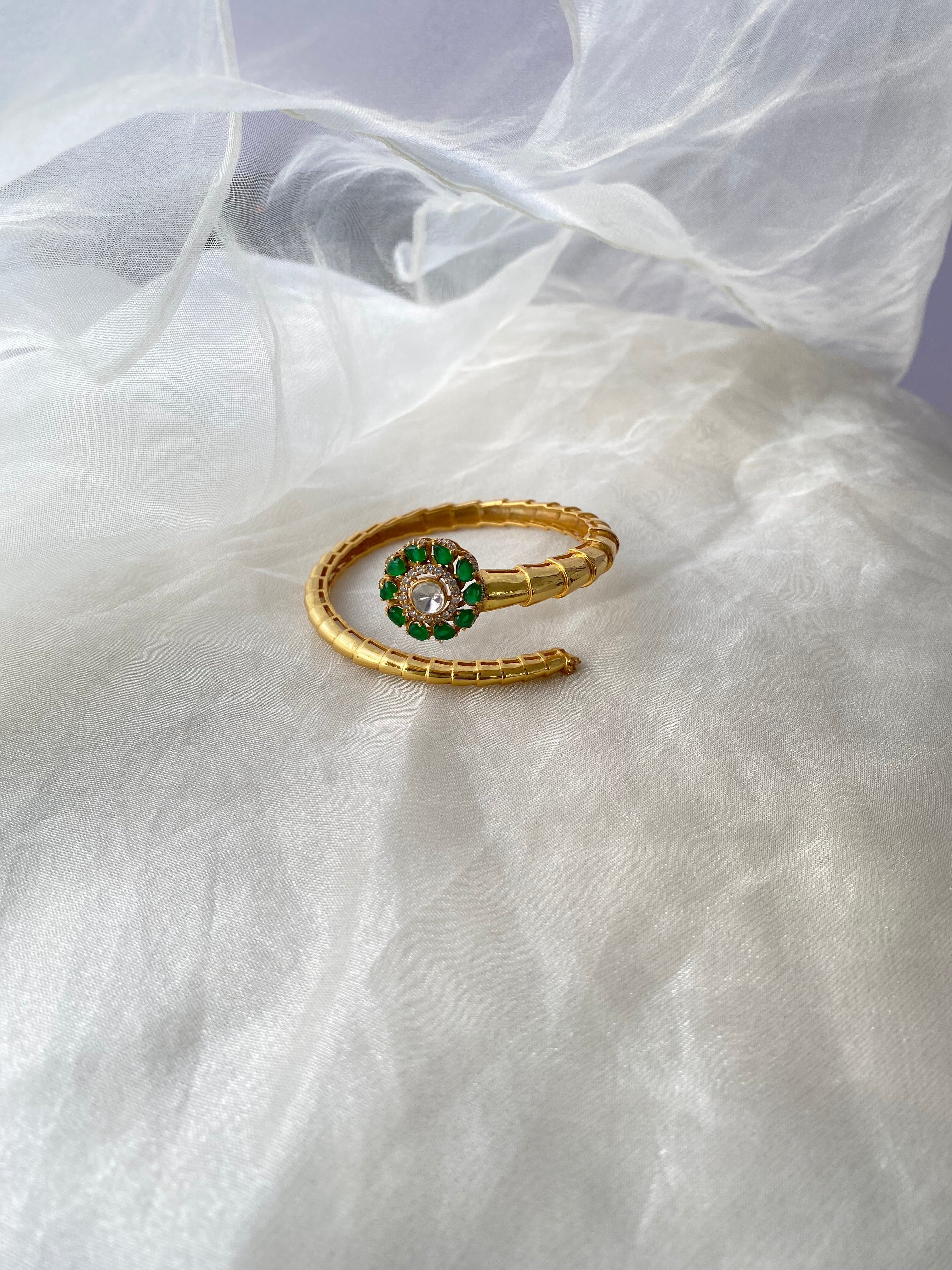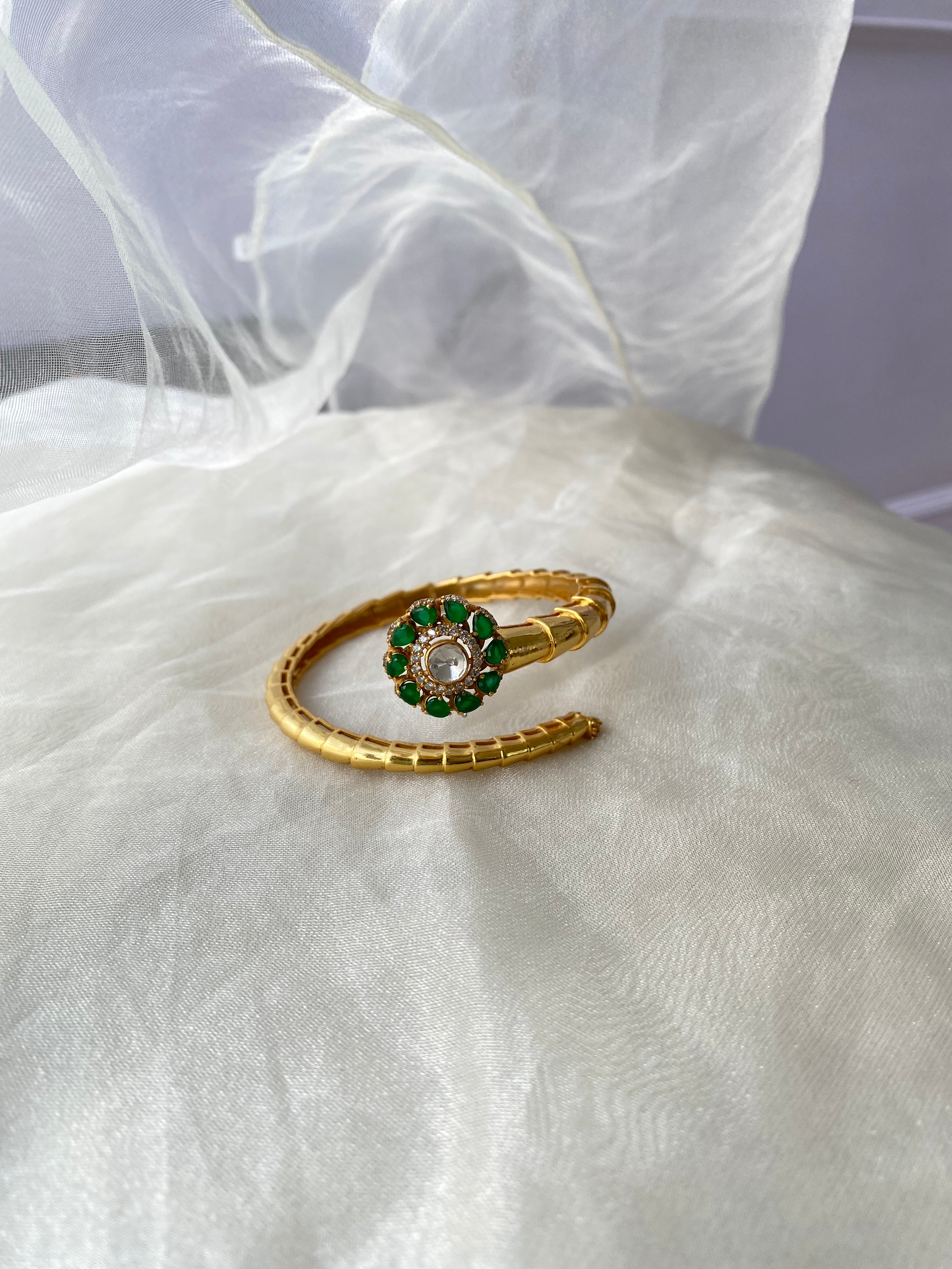 Discover elegance with meaning in this 92.5 sterling silver handcuff, hallmarked for authenticity and luxuriously gold plated for a radiant finish. The design is enriched with the brilliance of Moissanite, the sparkle of Swarovski cz, and the deep allure of green onyx, creating a jewel that is as timeless as it is versatile.