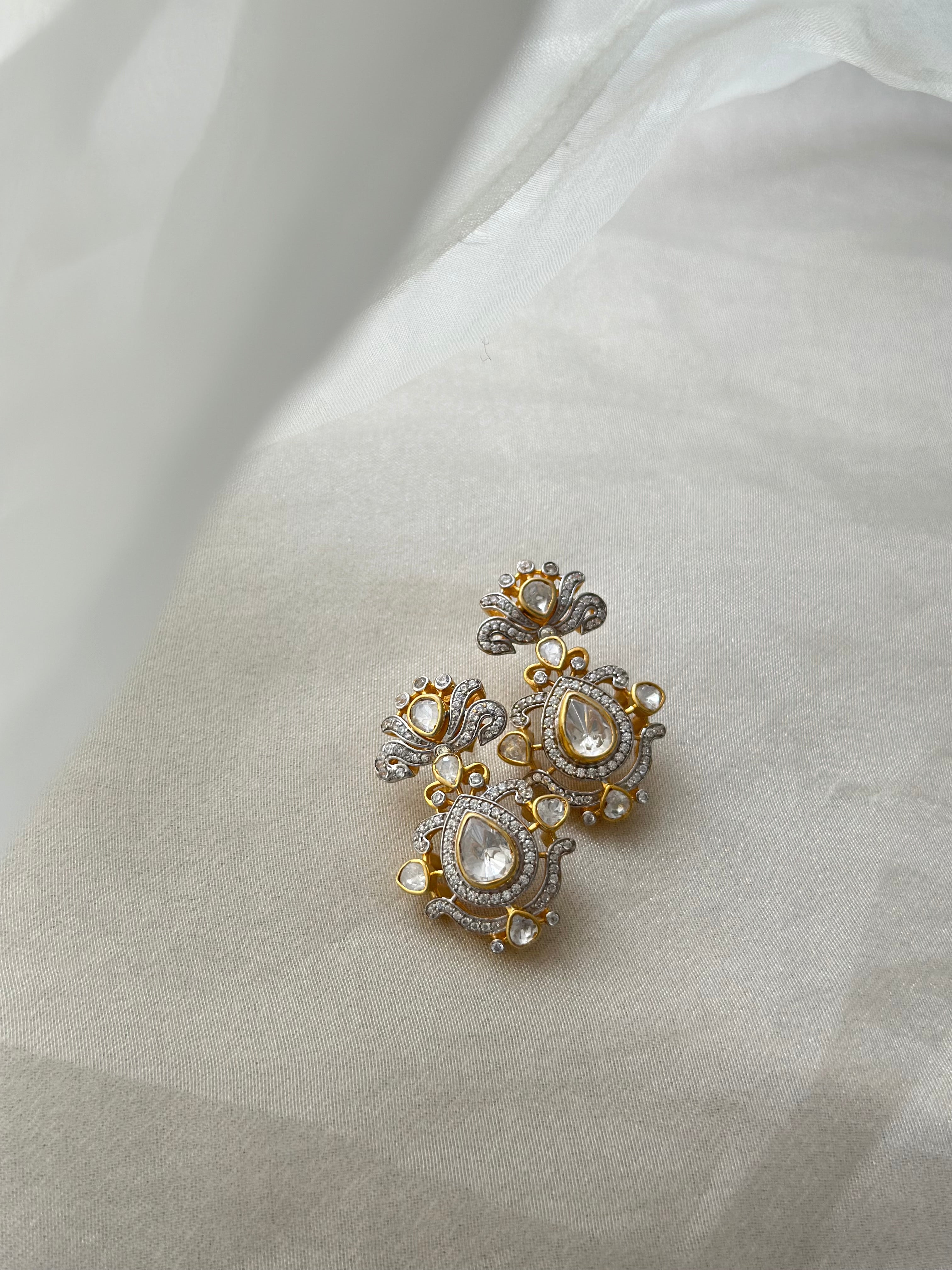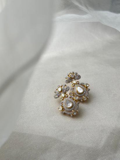 Elevate your style with these 92.5% fine silver stud earrings, gold-plated and hallmarked for authenticity. Measuring 3.5 cm, these elegant studs are adorned with Moissanite Polki and sparkling Swarovski accents, creating a perfect blend of timeless sophistication and modern glamour.