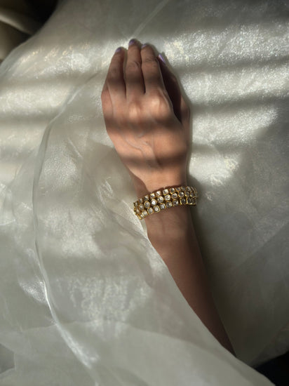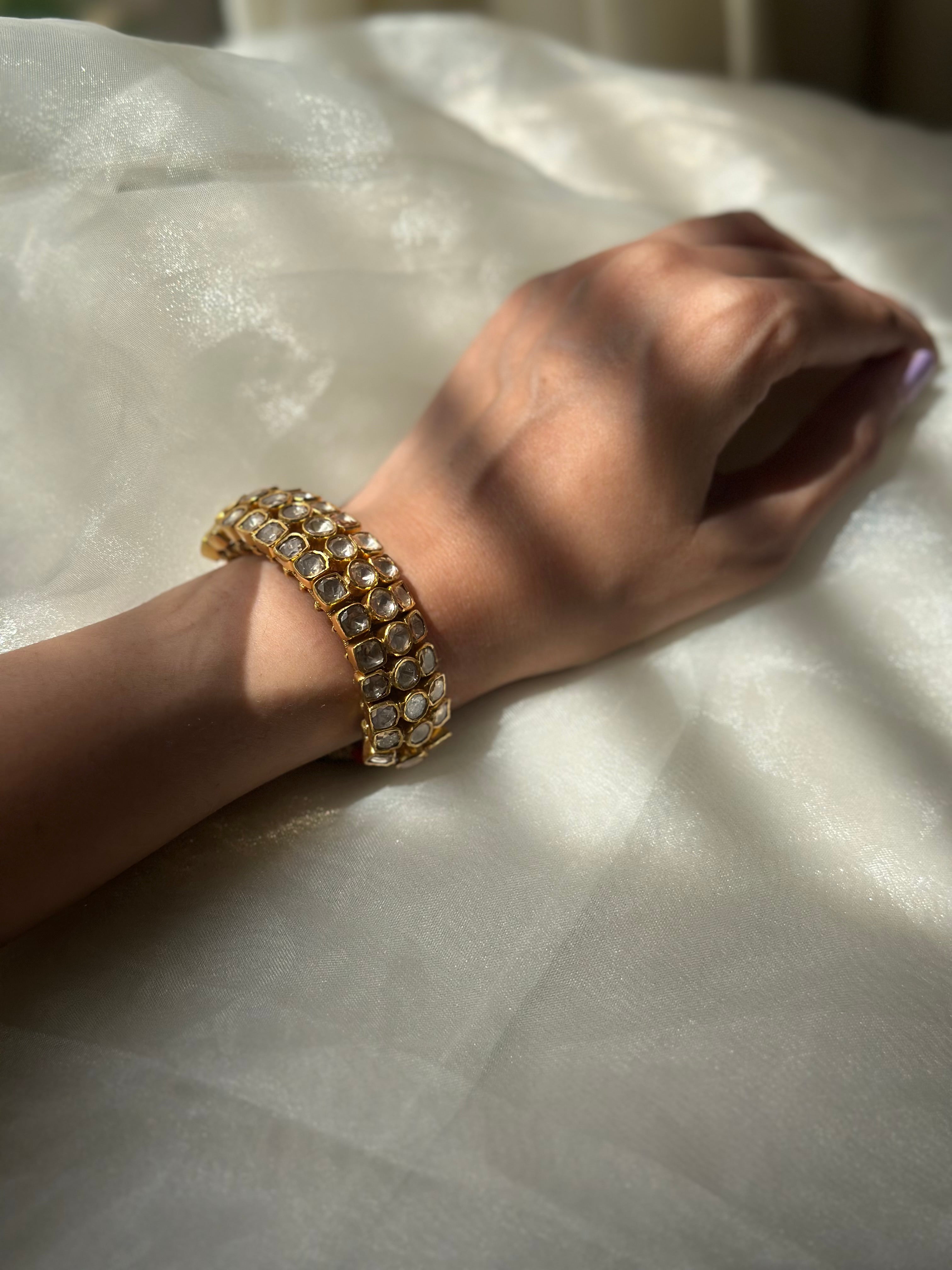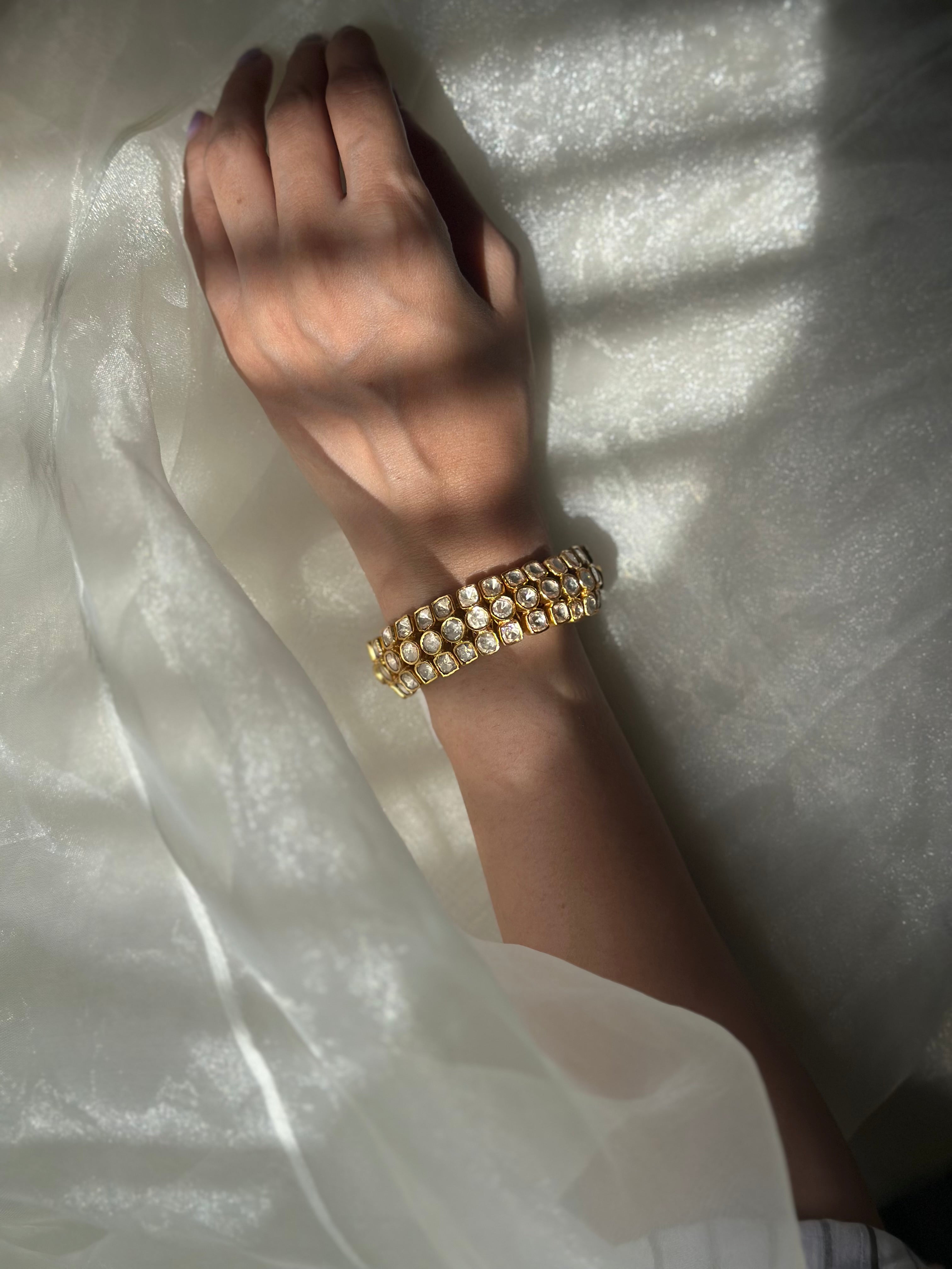 Each piece is adorned with Mossinate Polki gemstones, radiating the regal glow of uncut diamonds — a tribute to India’s royal heritage. Its adjustable design ensures a comfortable and secure fit, making it perfect for layering with your festive bangles or wearing solo as a statement heirloom.