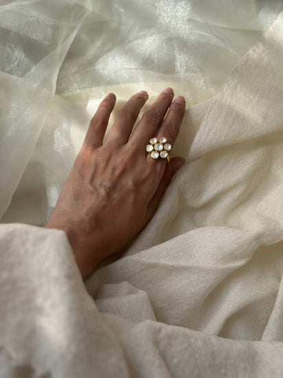Add a refined touch of luxury to your jewellery collection with this exquisitely crafted adjustable ring, made from hallmarked 92.5 fine silver and finished with a warm gold plating. At the center is a 2 cm motif adorned with a stunning combination of Polkis. , capturing the perfect balance between traditional charm and modern brilliance.