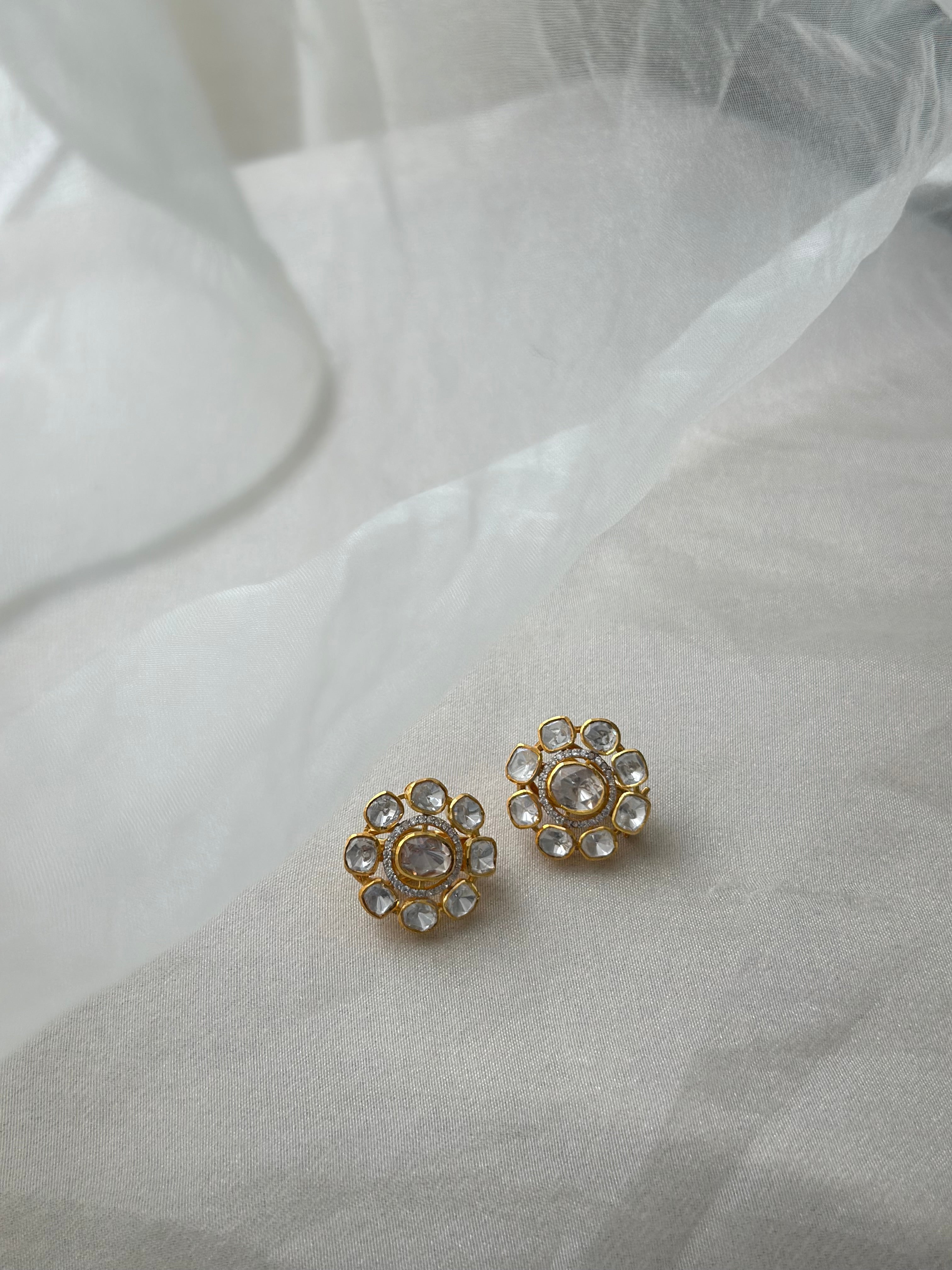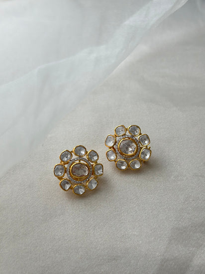 Expertly crafted from 92.5 hallmarked fine silver and luxuriously gold plated, these 2.5 cm stud earrings are adorned with a captivating combination of sparkling Moissanite Polki, and brilliant Swarovski CZ. The carefully arranged gemstones and refined detailing reflect the beauty of traditional Indian craftsmanship while offering versatile wearability for modern occasions.