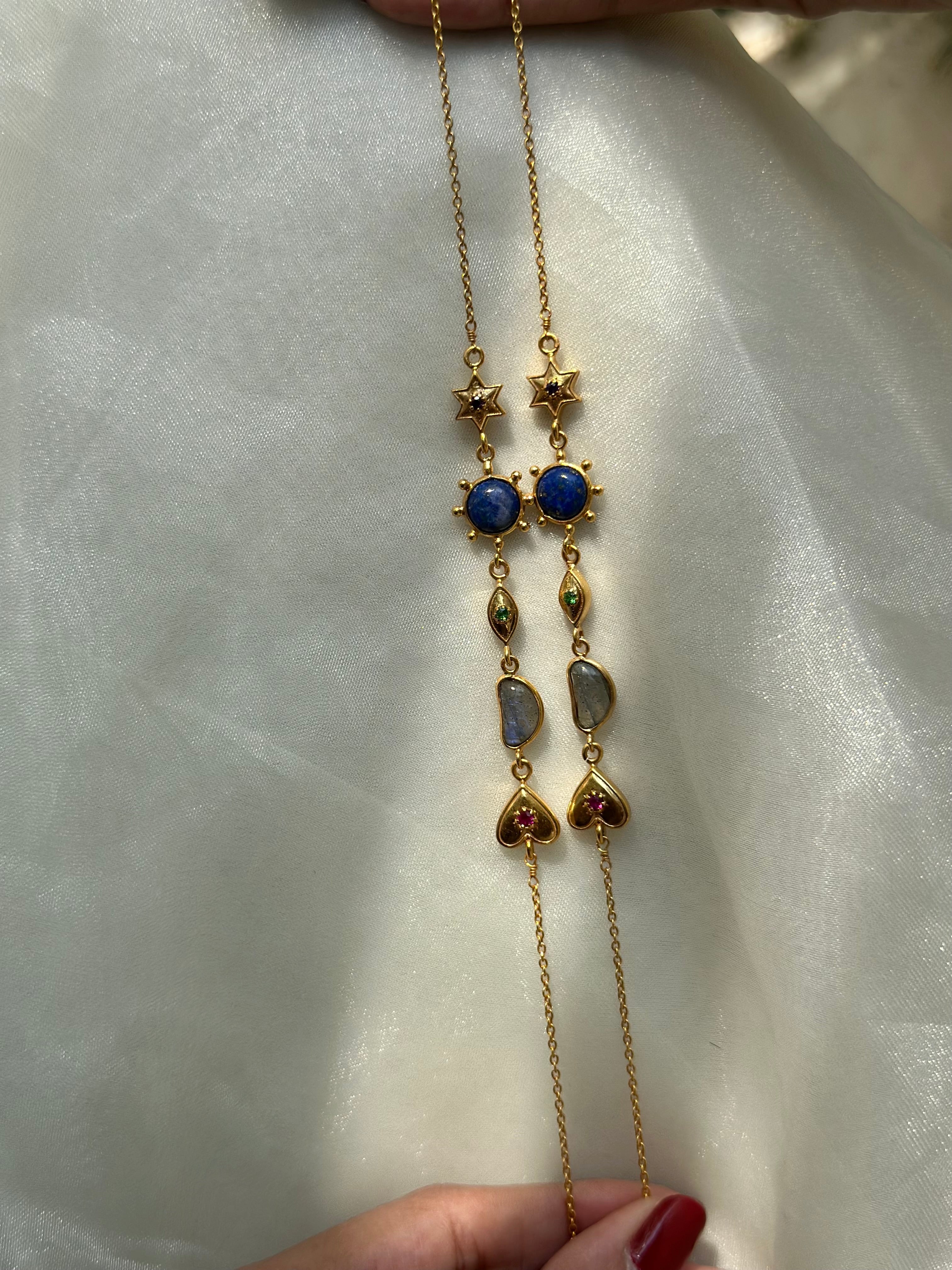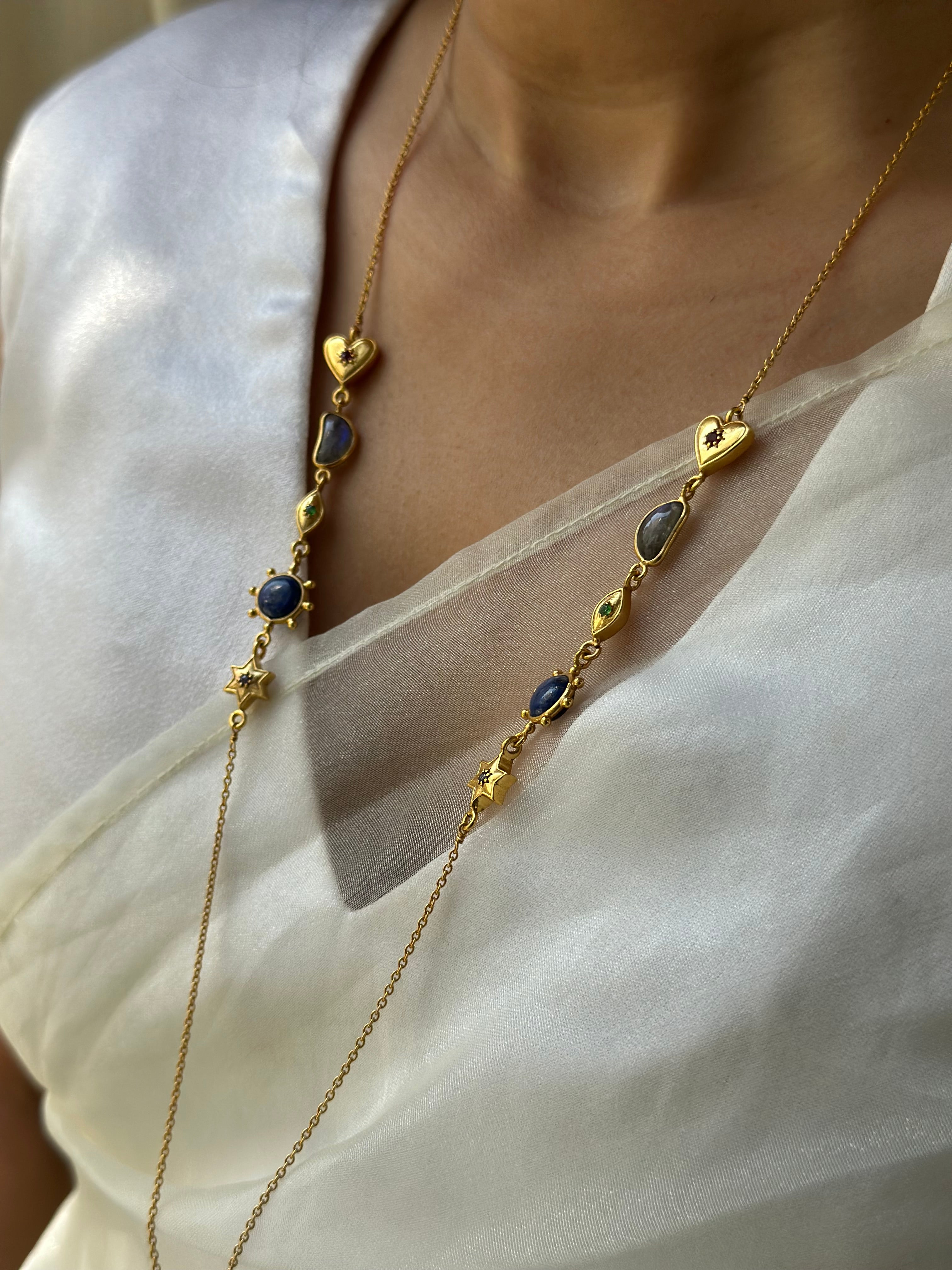 This 26-inch handcrafted chain is made from hallmarked 92.5 fine silver, finished in luxurious gold plating, and features double-lock clasps for seamless wear in multiple styles. Adorned with five celestial charms—Sun (Lapis), Heart (Ruby), Star (Amethyst), Eye (Emerald), and Moon (Opal)—this piece is a stylish tribute to the universe and your many moods.