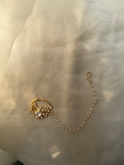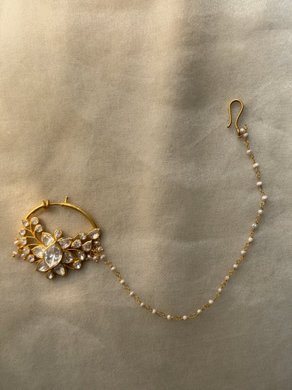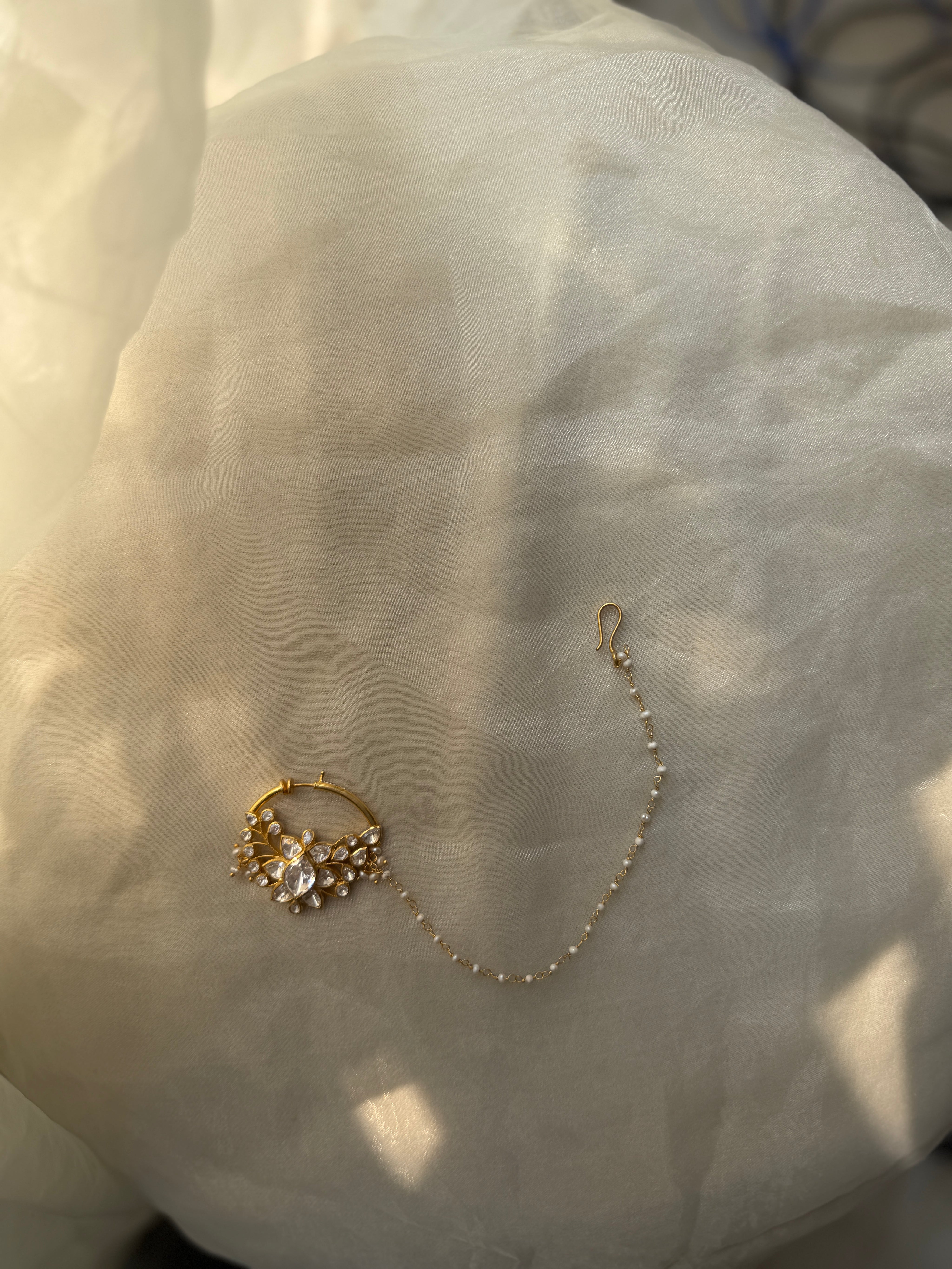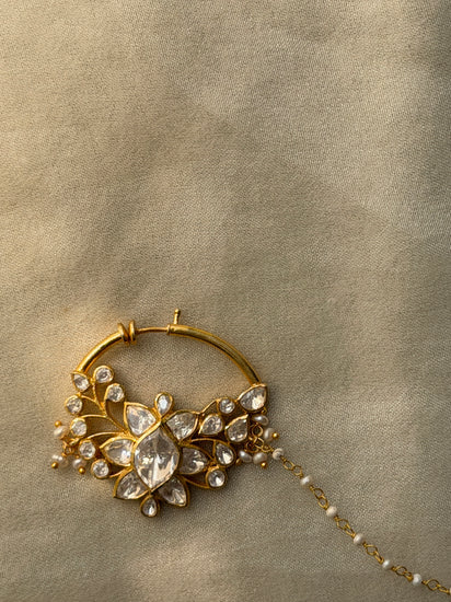 A timeless emblem of elegance, this handcrafted nath (nose ring) is crafted in hallmarked 92.5 fine silver and finished with rich gold plating for a radiant traditional sheen. Adorned with Moissanite polkis and delicate pearls, it catches the light beautifully—perfect for brides, festive occasions, and cultural celebrations.Measuring 3.8 cm, it offers a refined silhouette that complements both classic and modern Indian looks with effortless grace.