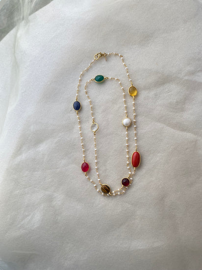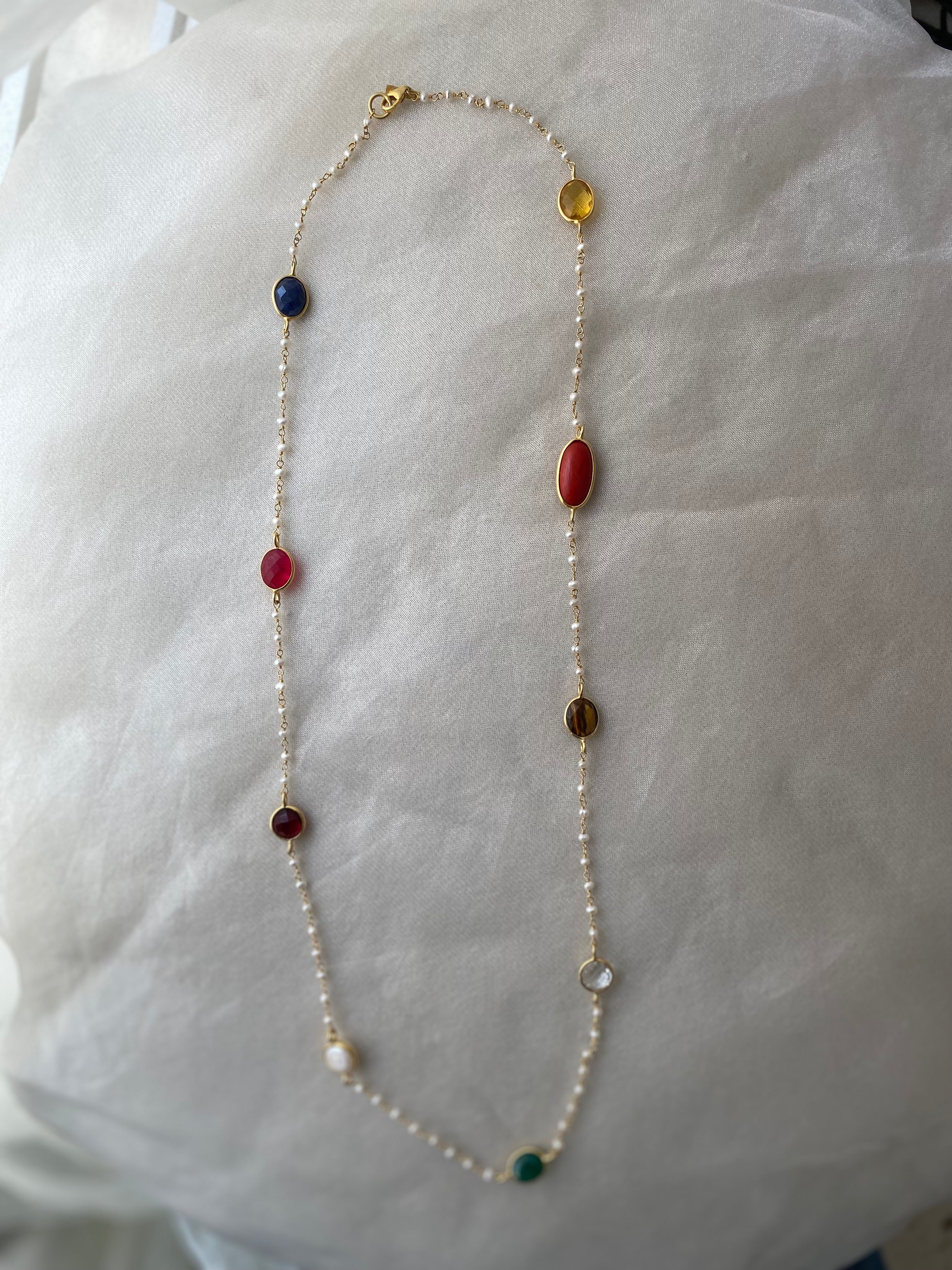 This necklace is centered around the Navratna, a sacred combination of nine gemstones, each offering its own powerful energy and significance. The gemstones used include:
