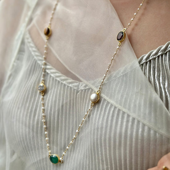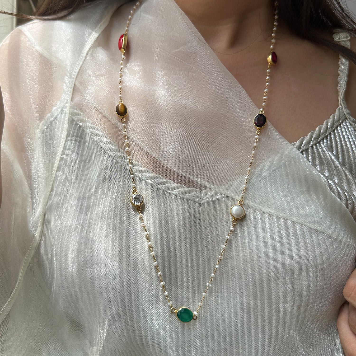 This necklace is centered around the Navratna, a sacred combination of nine gemstones, each offering its own powerful energy and significance. The gemstones used include: