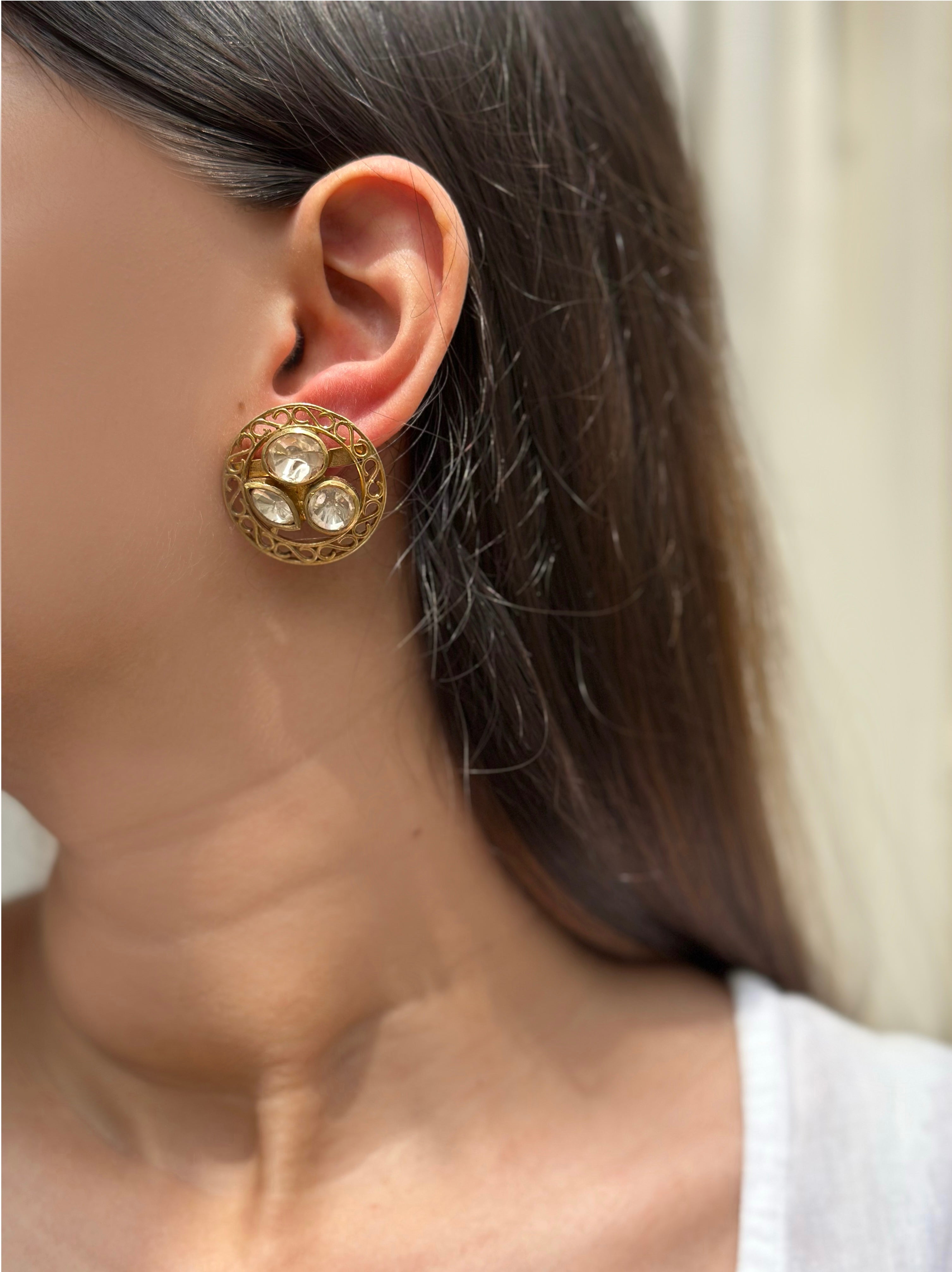 Featuring luminous Moissanite Polki gemstones, these studs sparkle with subtle grace, making them the perfect accessory for both day and evening wear. With a diameter of 2.8 cm, they offer a bold yet wearable look — elegant enough for formal occasions, yet versatile for festive celebrations.