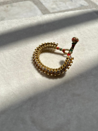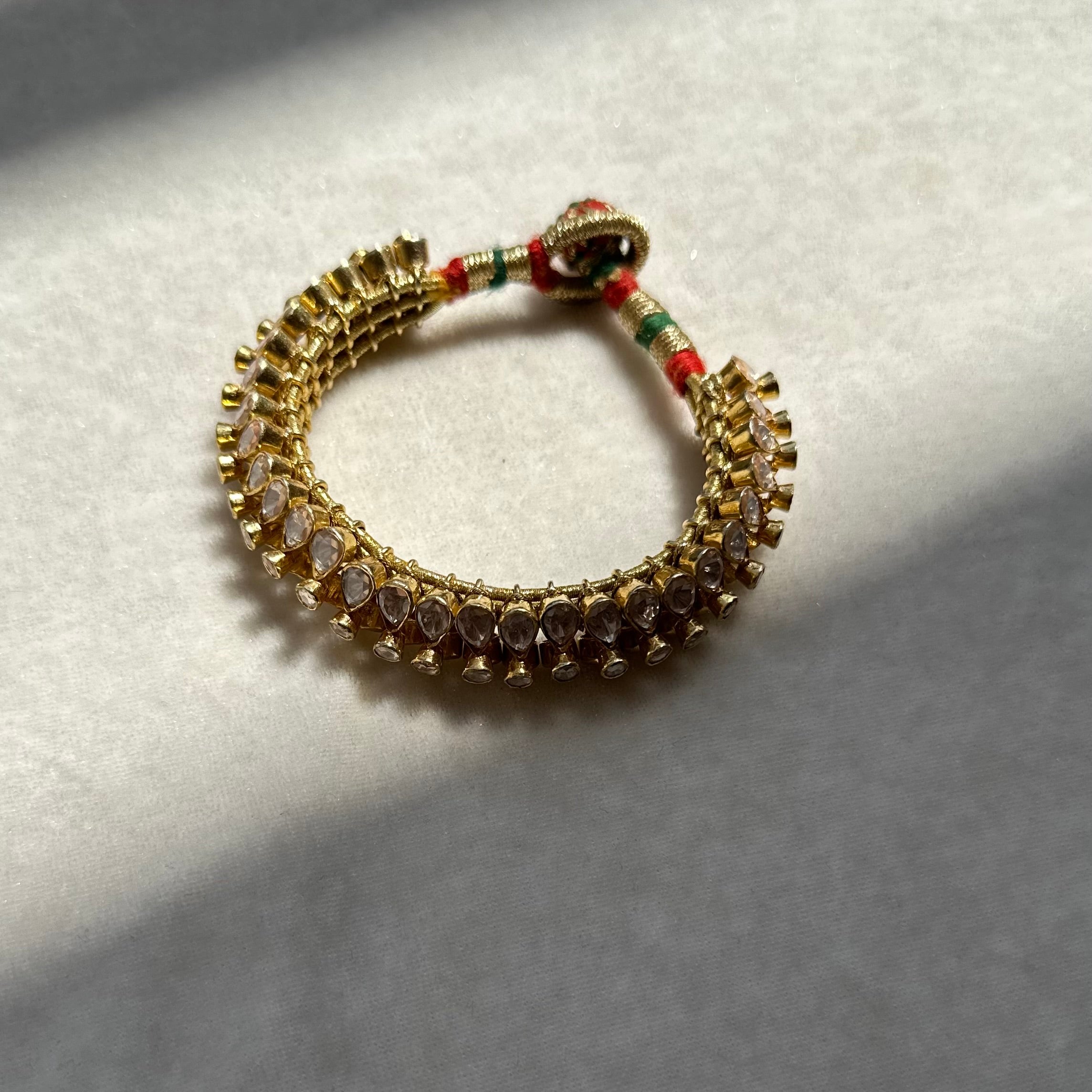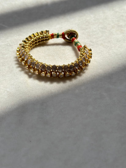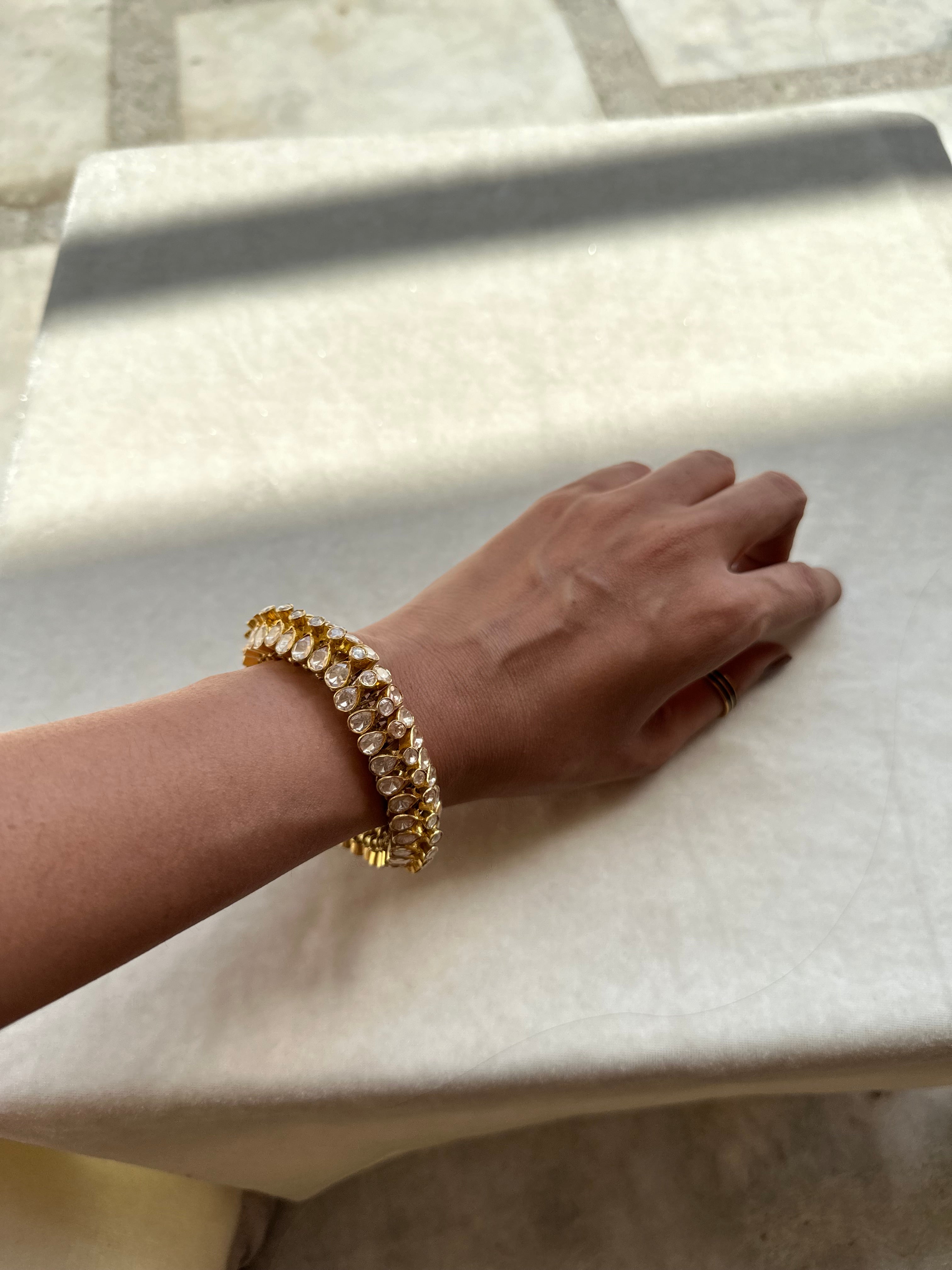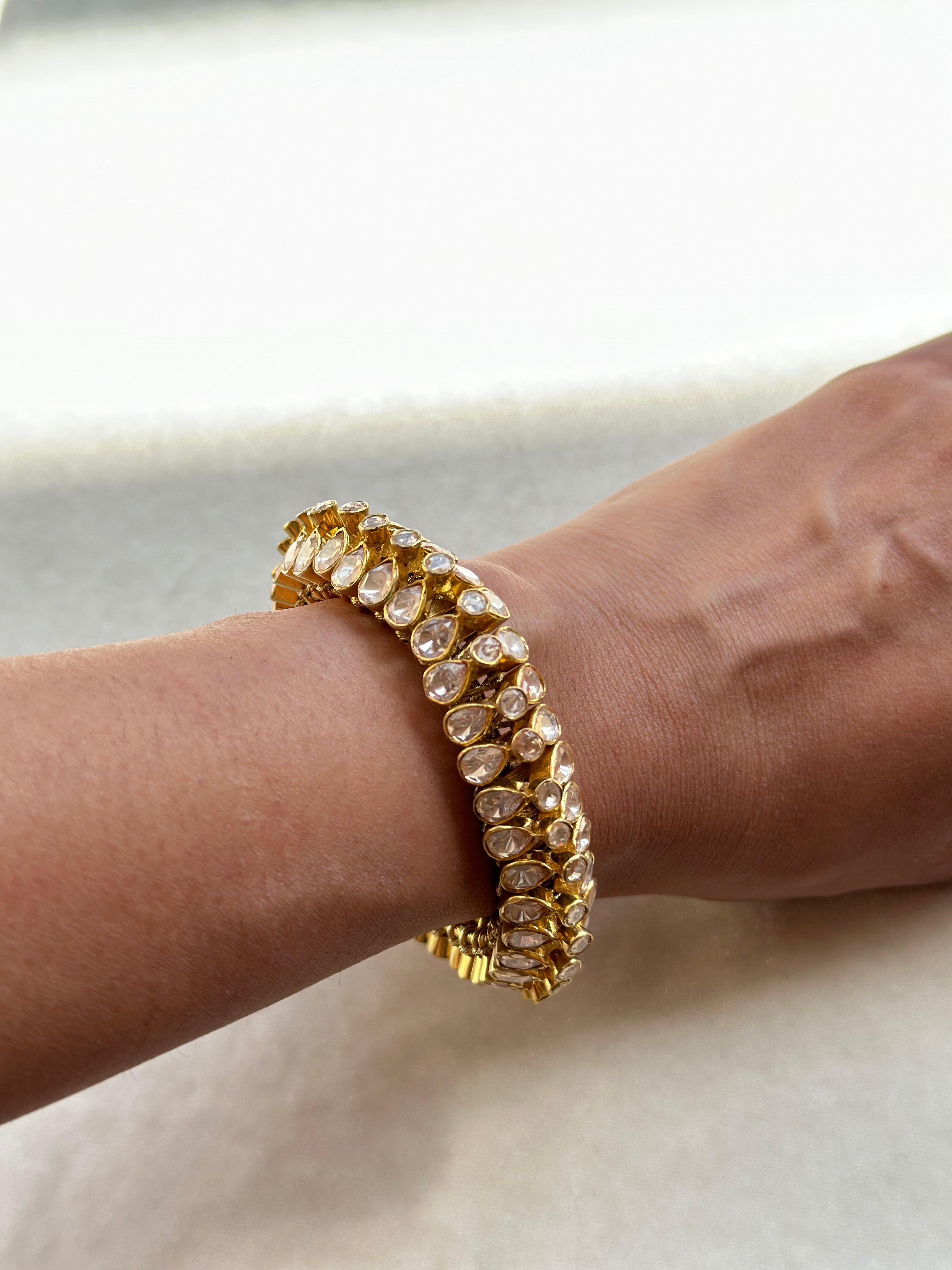 Add timeless sparkle to your wrist with this adjustable Moissanite Polki bracelet, handcrafted in hallmarked 92.5 fine silver and luxuriously gold plated. Designed to fit comfortably on any wrist, each piece showcases the brilliance of Moissanite Polkis, making it a versatile and eye-catching accessory for both everyday wear and special occasions.