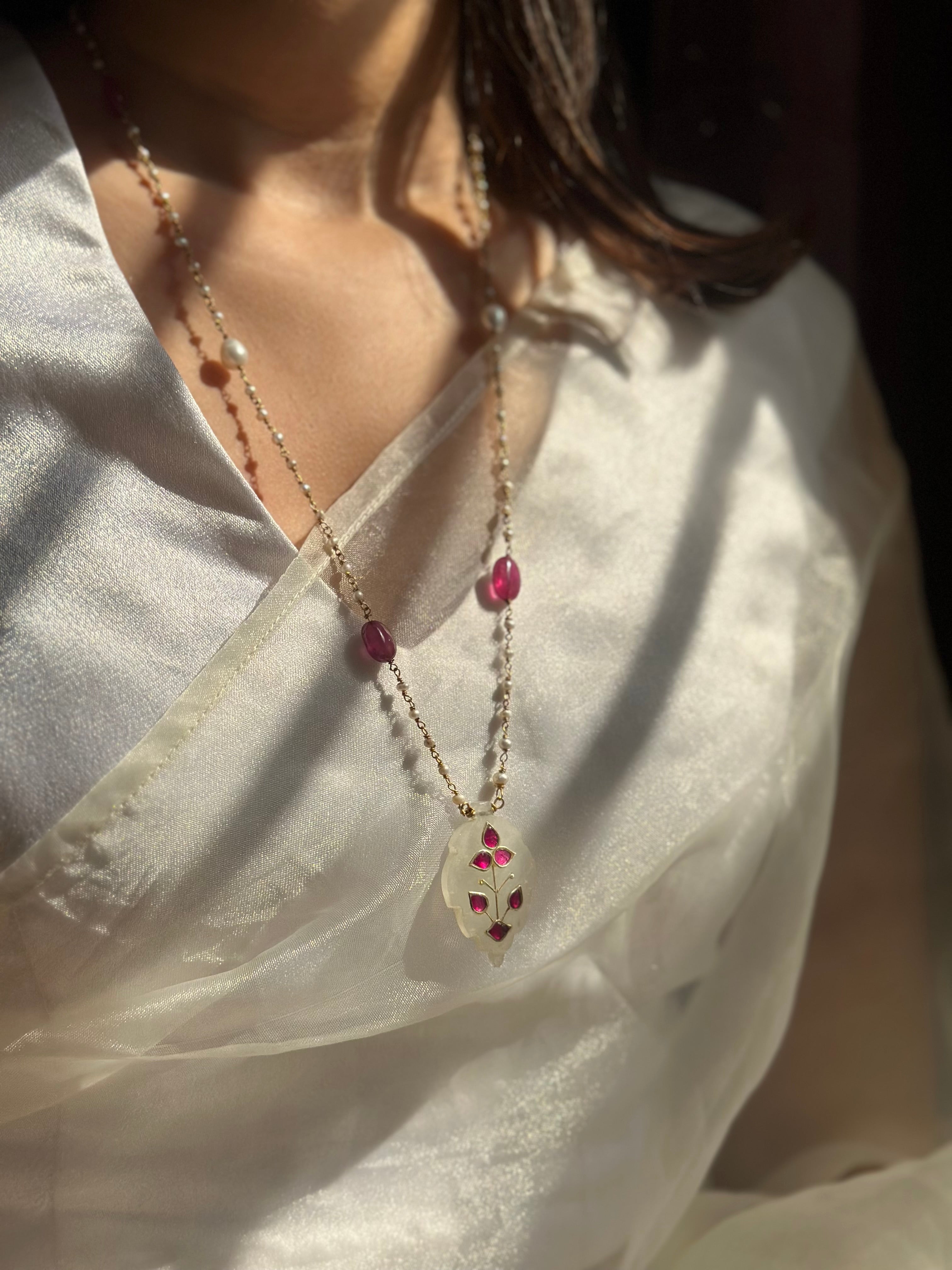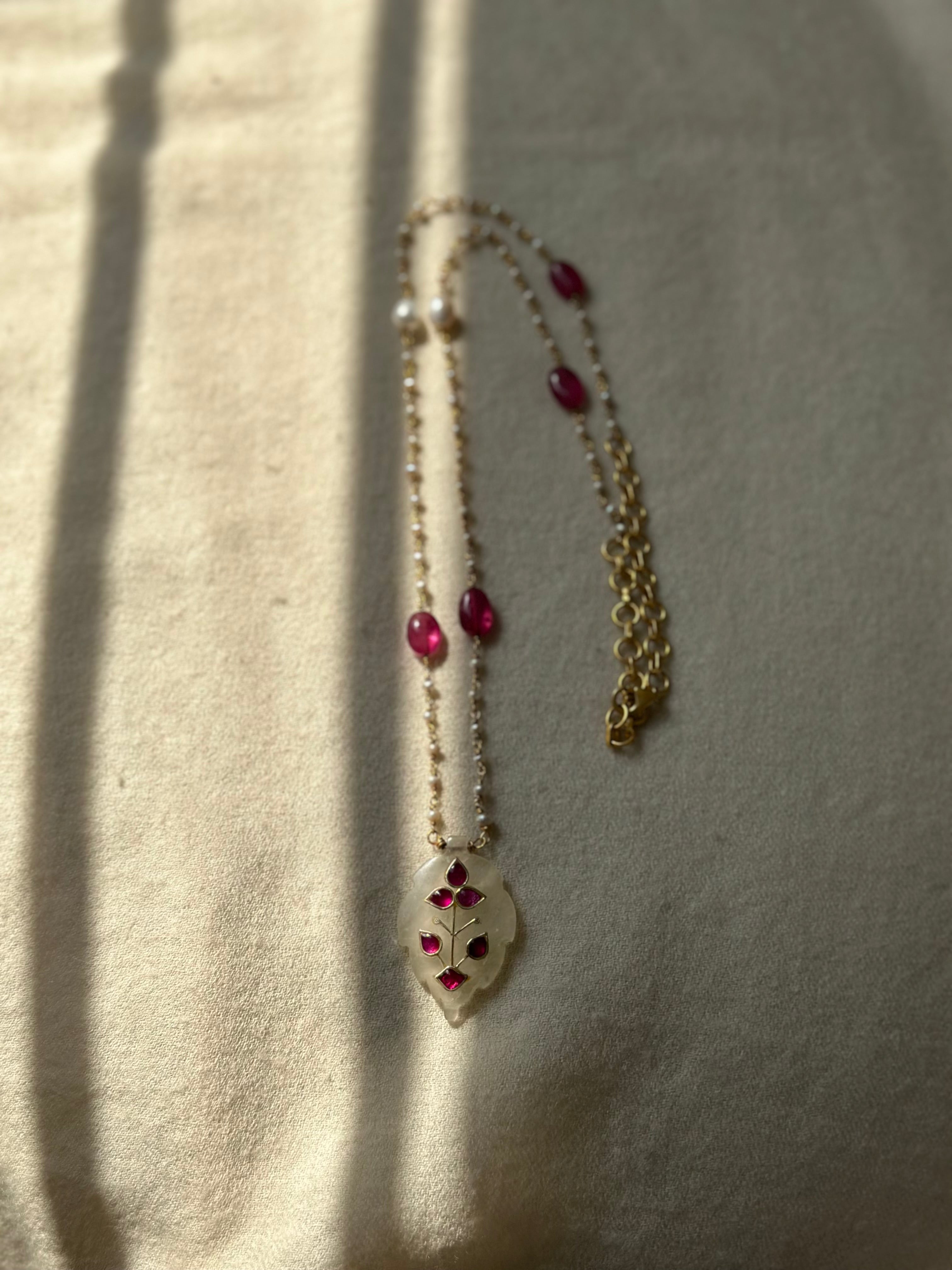 From our Exclusive Antique Finds, this one-of-a-kind necklace is a celebration of age-old artistry and modern refinement. Handcrafted in hallmarked 92.5 fine silver and luxuriously gold plated, it features delicate jade inlay work, accented with vibrant ruby stones and lustrous freshwater pearls.