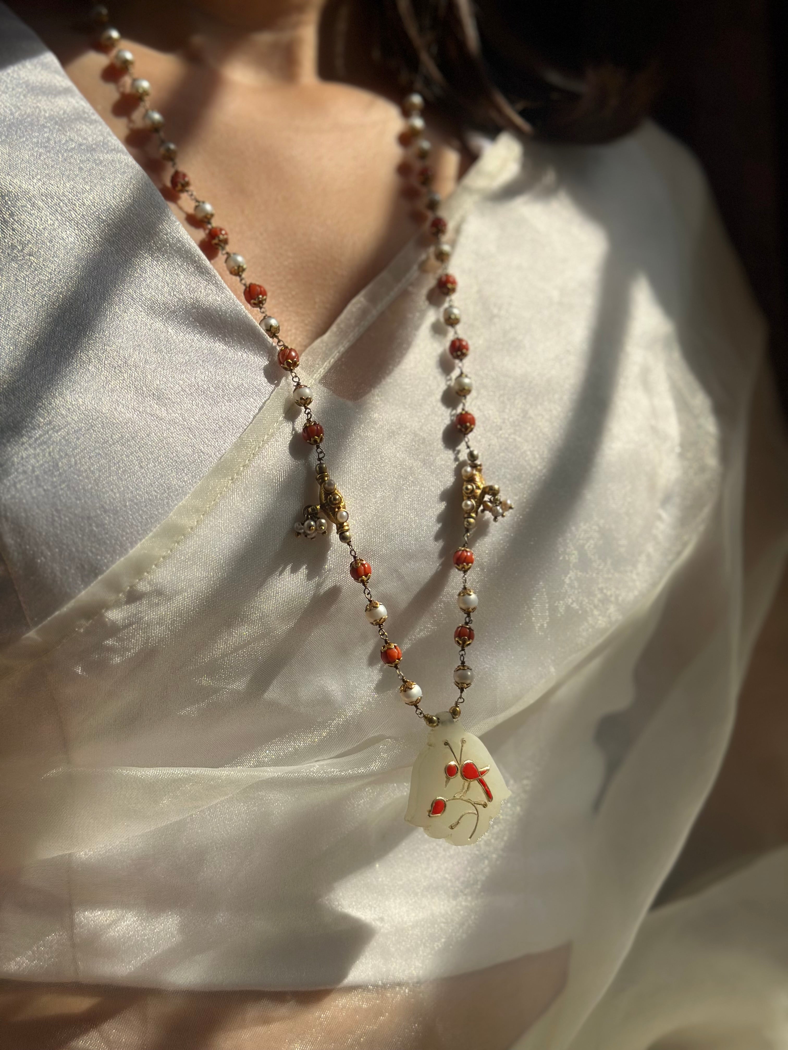 A rare treasure from our Exclusive Antique Finds, this one-of-a-kind necklace is handcrafted in hallmarked 92.5 fine silver, then richly gold-plated for a regal finish. Featuring intricate jade inlay work, complemented by natural corals and freshwater pearls, the design evokes old-world grandeur with a modern soul.