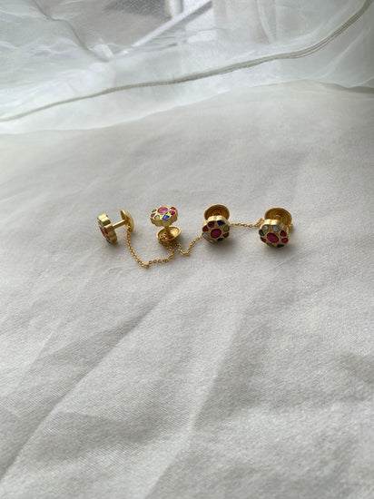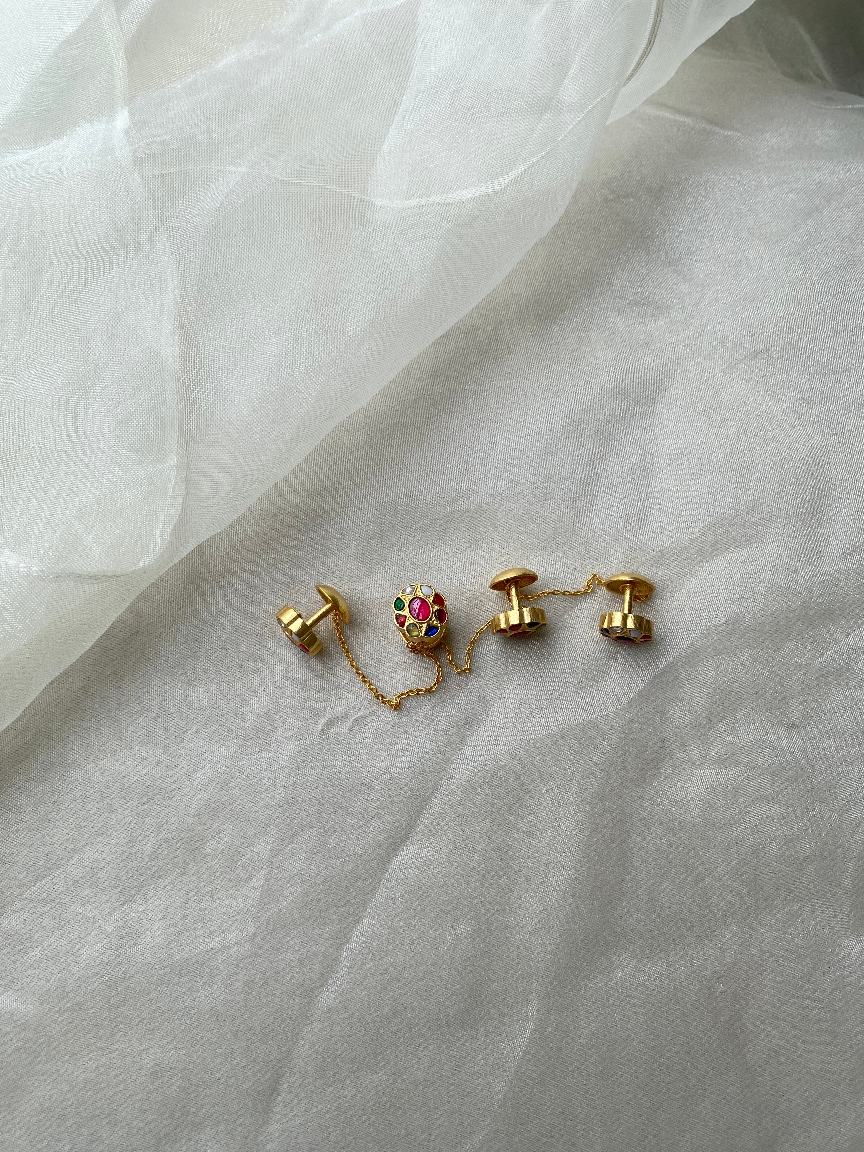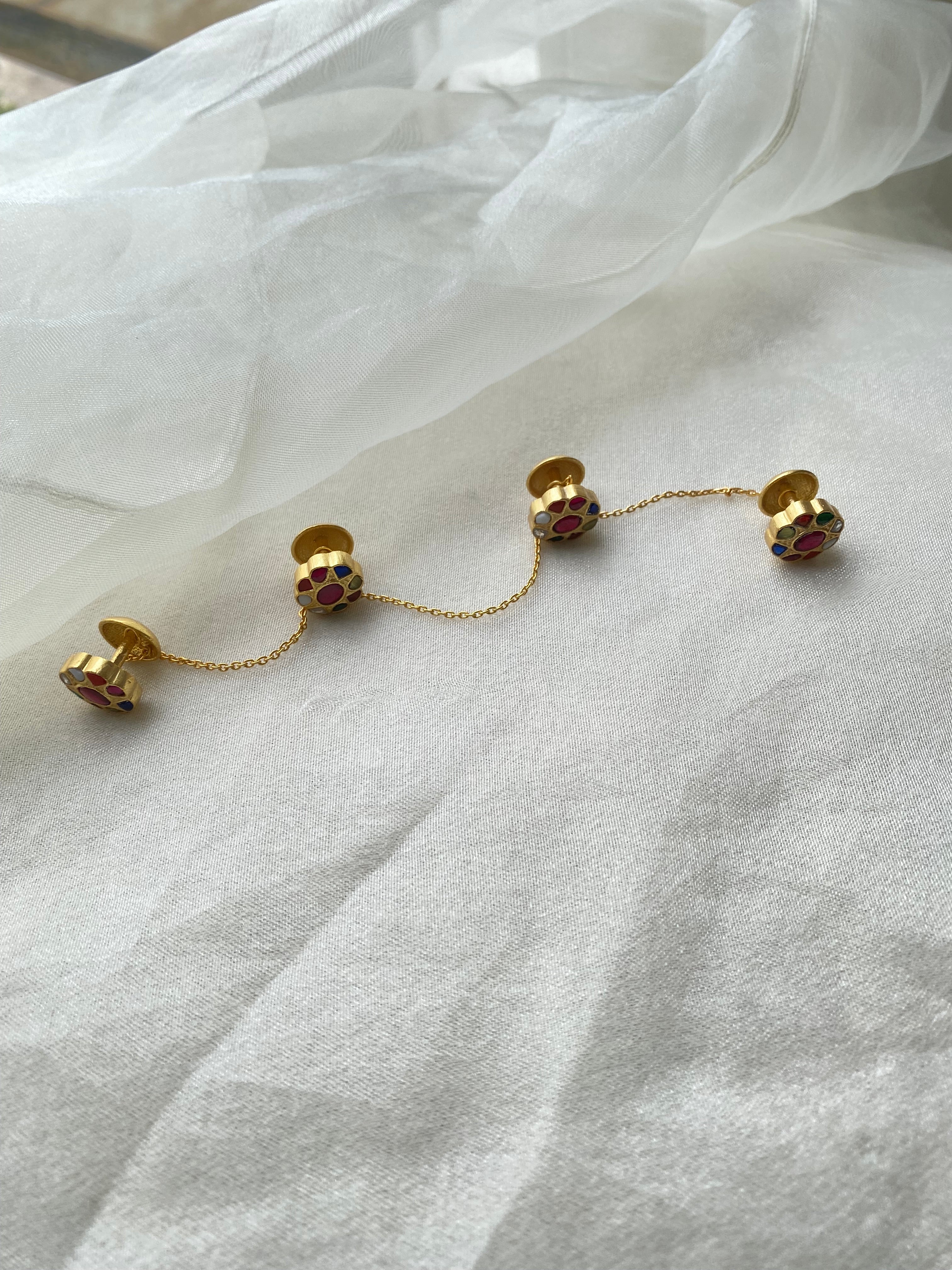 Crafted for those who appreciate elegance with depth, this handmade gemstone button chain is a luxurious accessory designed to complete your ensemble with purpose and prestige. Made from hallmarked 92.5 fine silver and finished in a lustrous gold plating, this piece is beautifully adorned with a mix of natural gemstones, semi-precious stones, and a touch of Swarovski brilliance.
