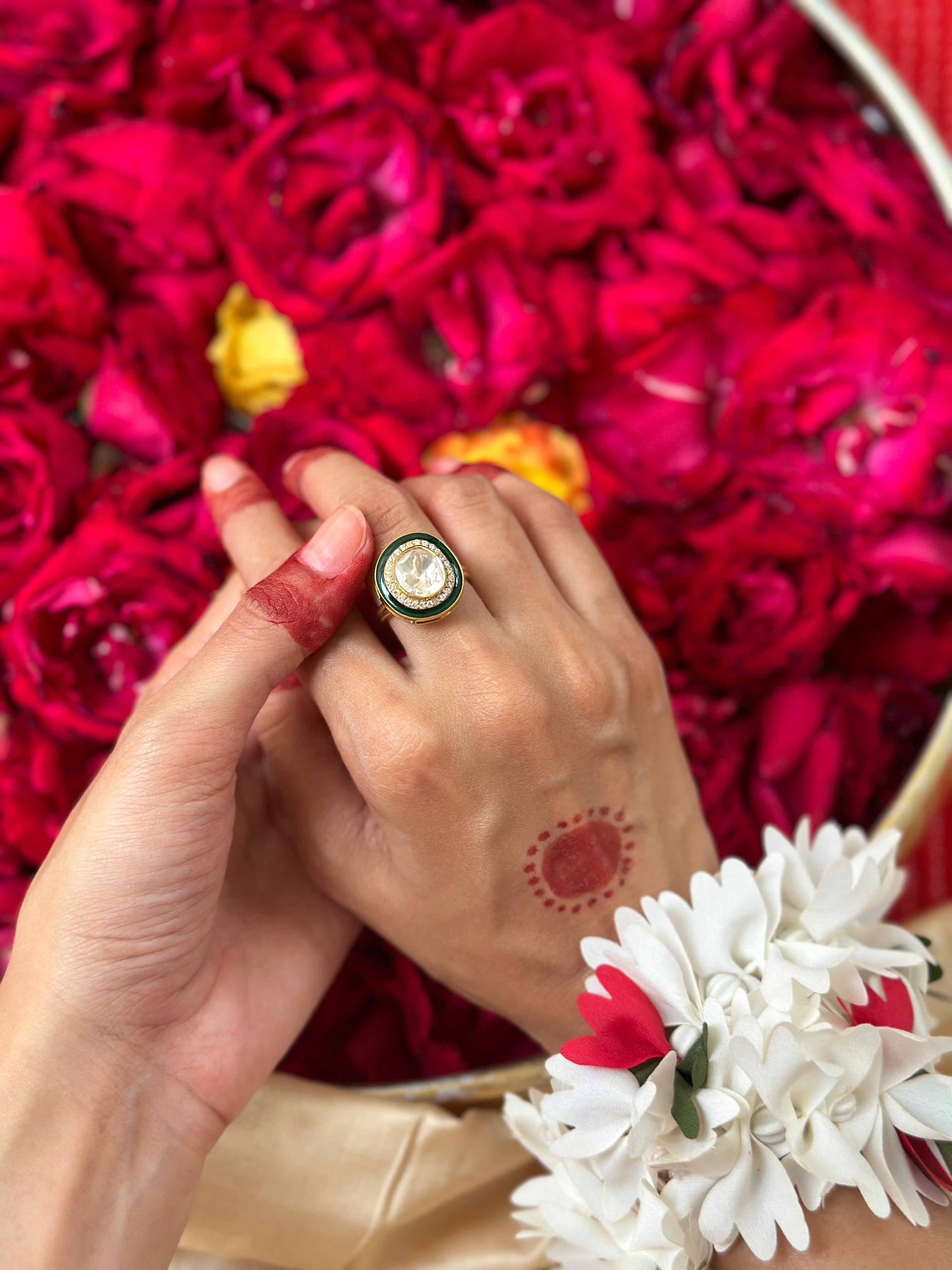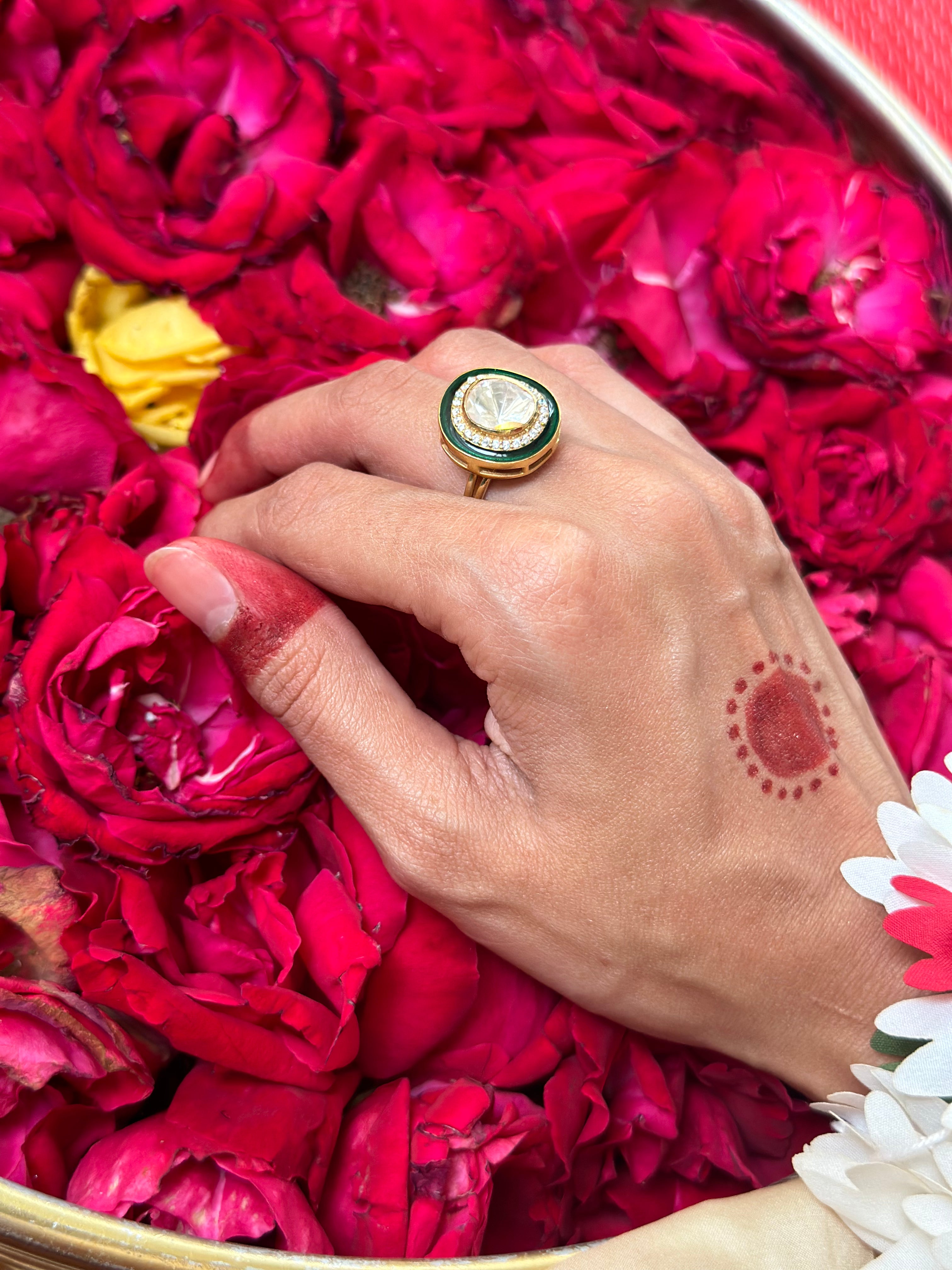 Handcrafted in hallmarked 92.5 fine silver and finished with luxurious gold plating, this adjustable ring features a striking Moissanite Polki center surrounded by Swarovski accents, all framed with a rich green enamel halo. The 1.5 cm element size makes it a bold yet graceful statement, perfect for festive occasions, weddings, or elevating your everyday ethnic wear.