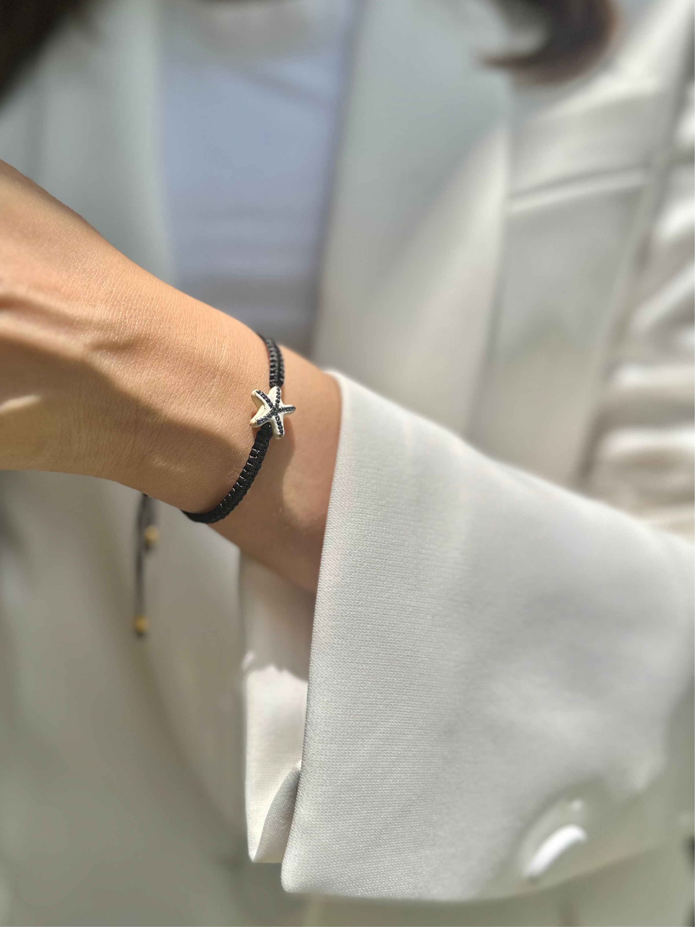 Crafted in hallmarked 92.5 fine silver with a regal Victorian finish, this dainty starfish bracelet blends ocean-inspired whimsy with timeless luxury. Adorned with 0.25 ct of natural blue sapphires and accented with soft white enamel, the 1 cm starfish motif sparkles with delicate, nautical beauty.