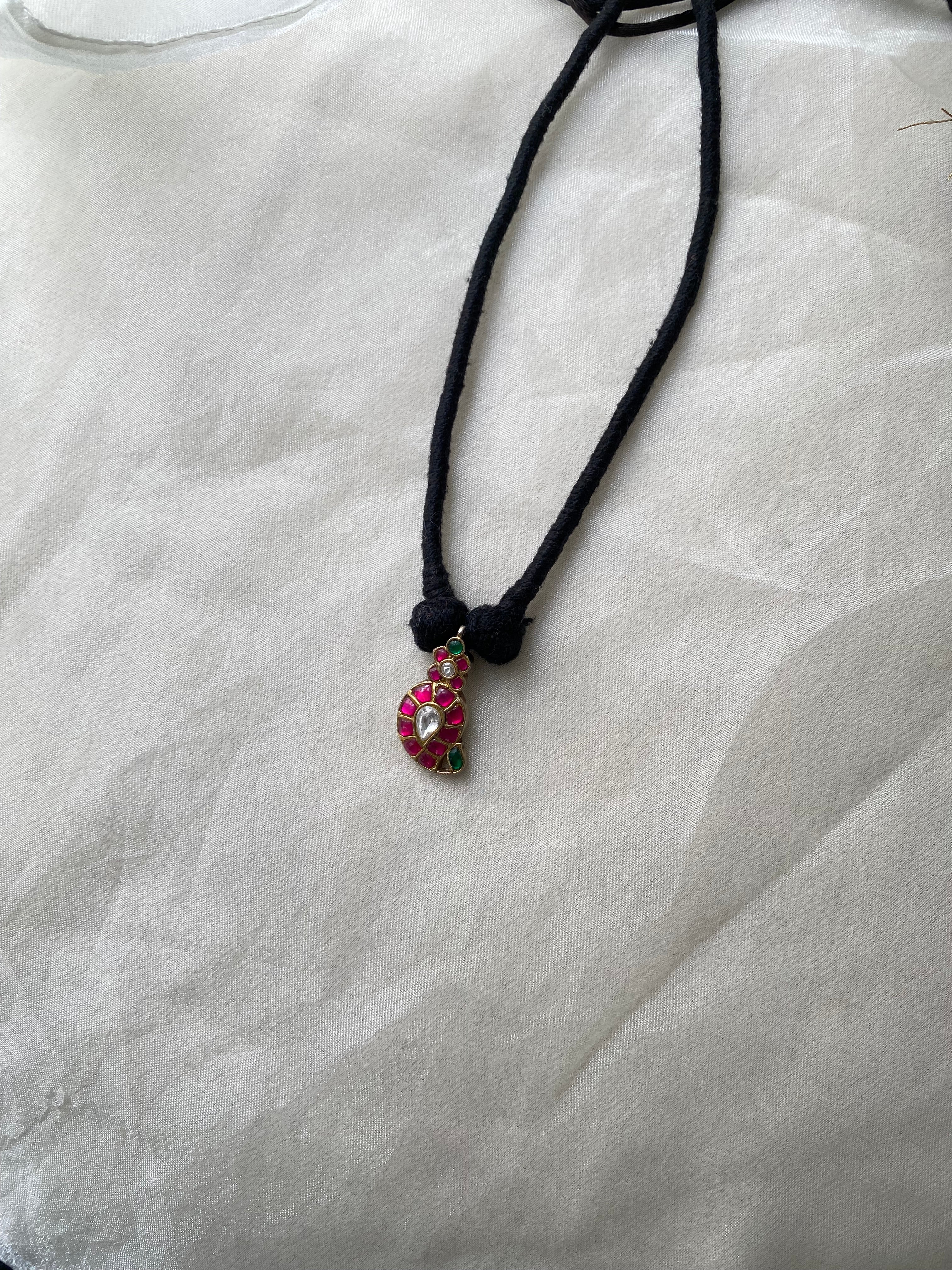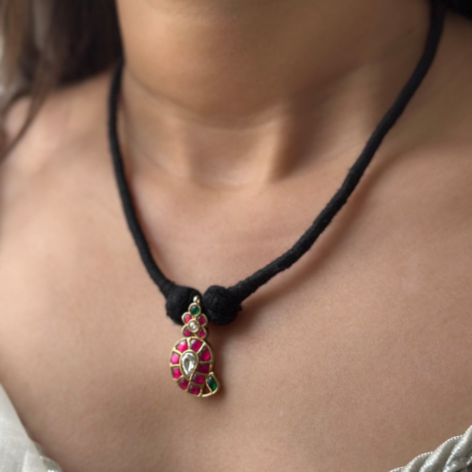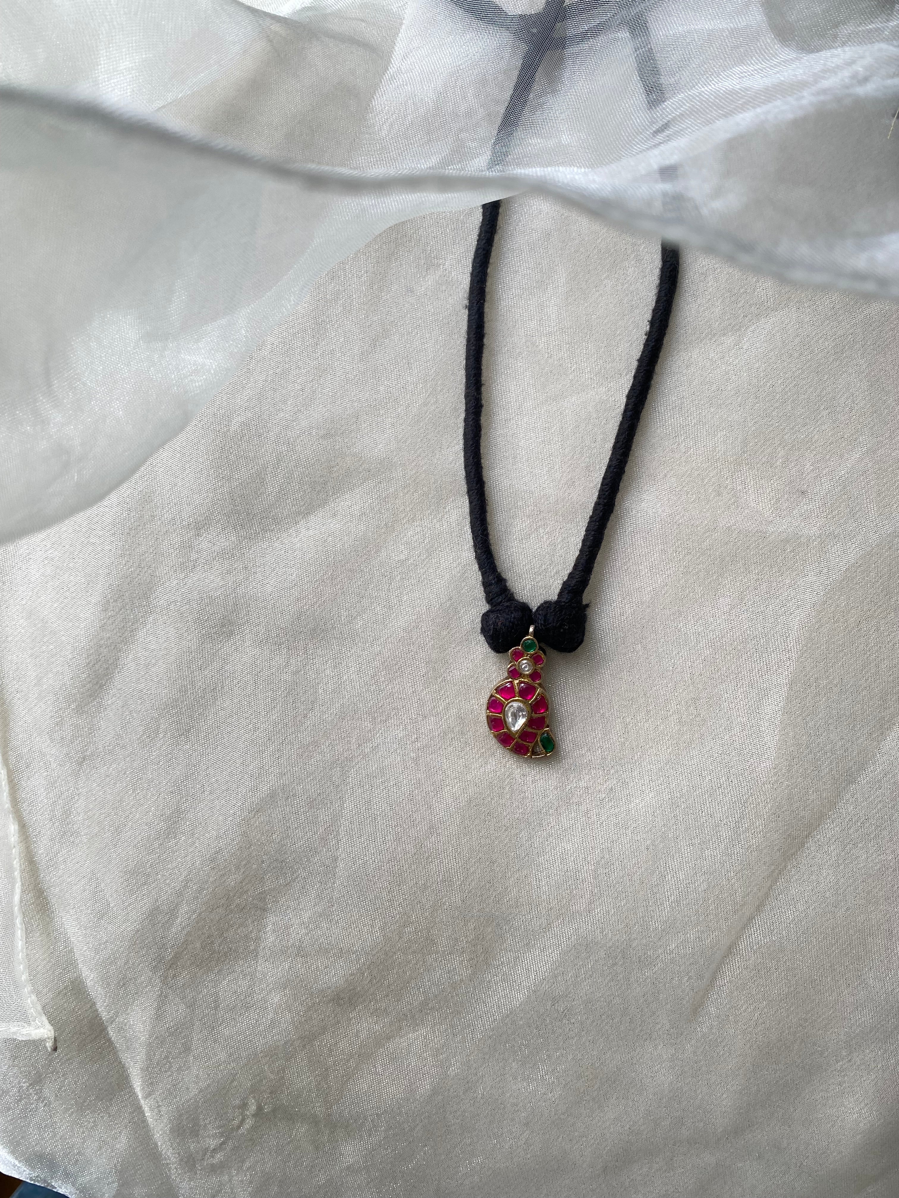 Keywords: kundan pendant necklace, ruby emerald silver jewellery, gold plated traditional necklace, 92.5 silver kundan necklace, handmade thread work necklace, Indian festive jewellery, gemstone pendant necklace, silver necklace with kundan, heirloom style jewellery, kundan choker necklace.