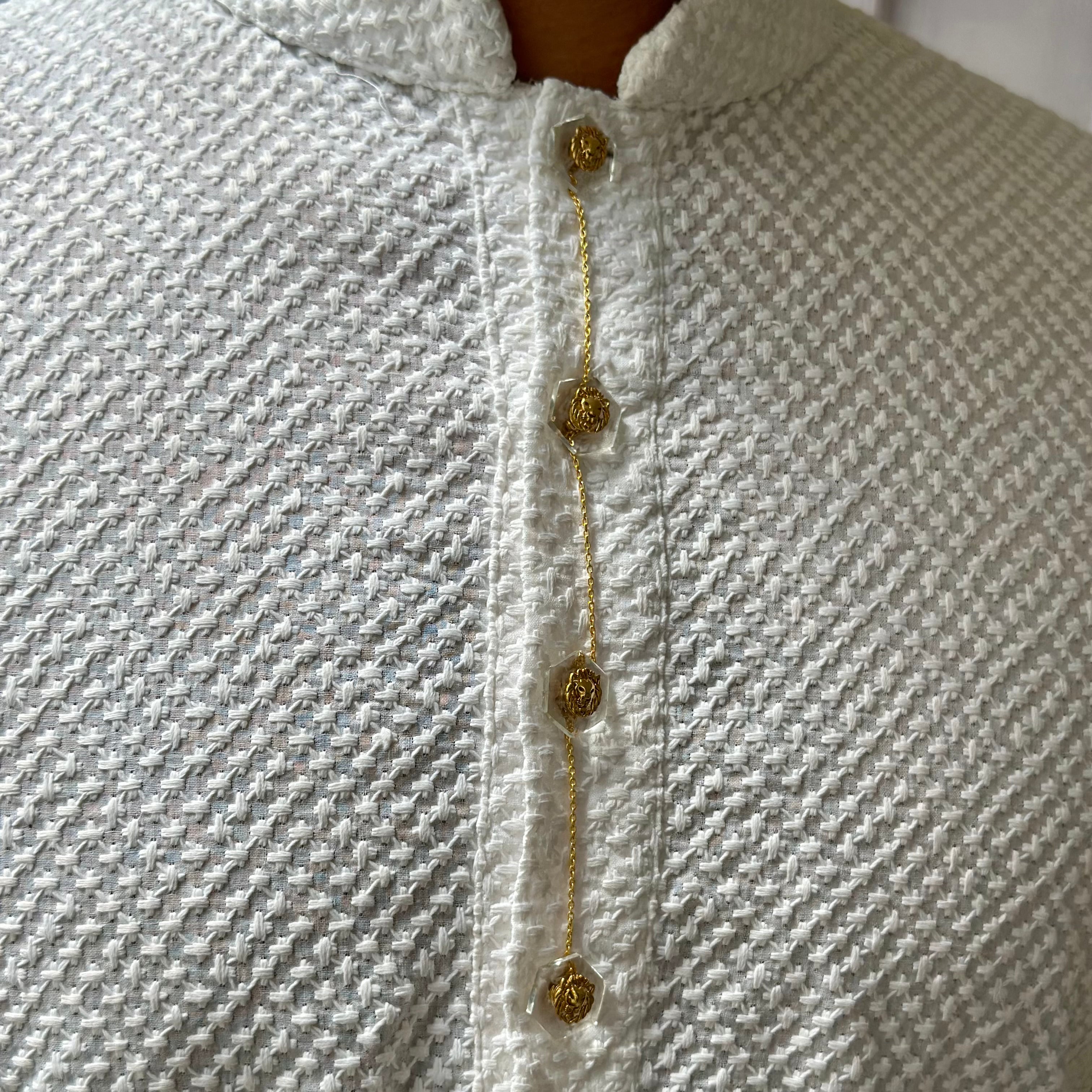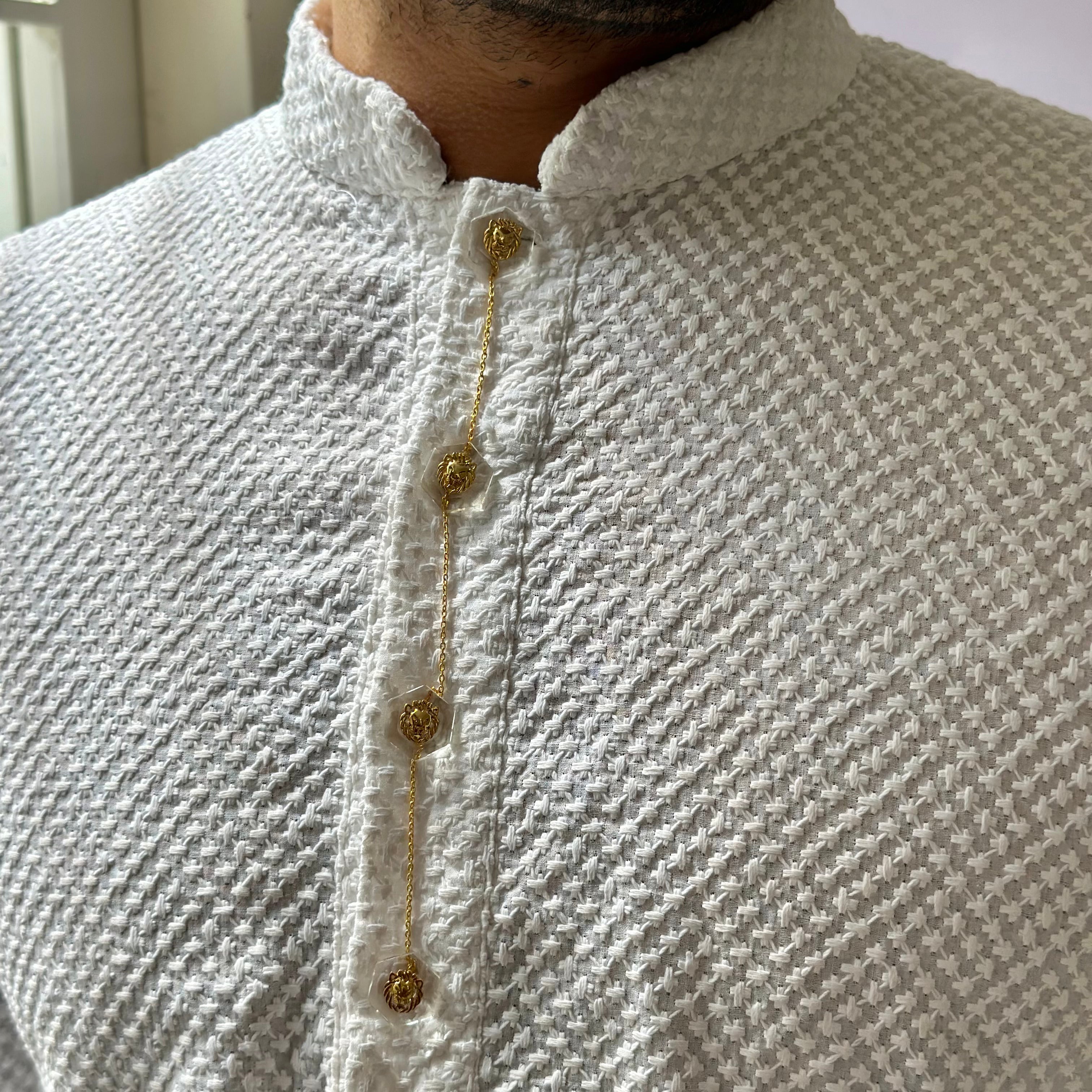 With a 6 cm chain length between buttons, this elegant yet powerful accessory transforms your kurta into a canvas of personal symbolism. Perfect for festive wear, weddings, or making a subtle statement at formal events.