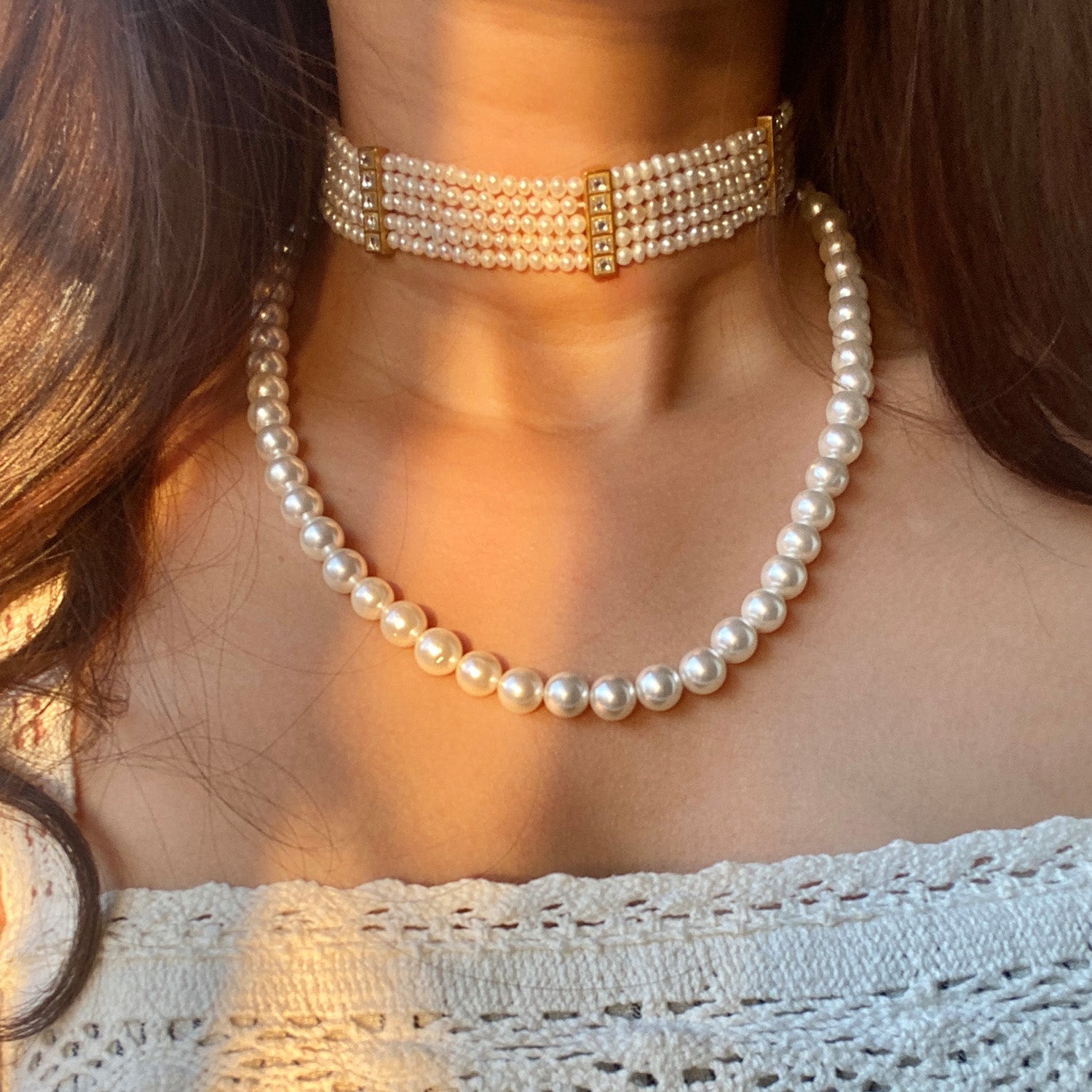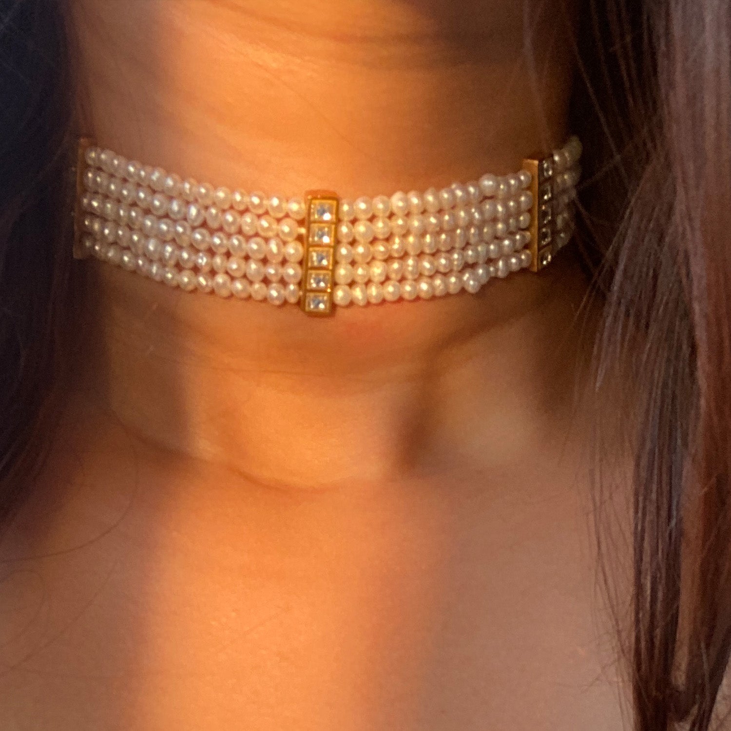 Refined elegance meets handcrafted tradition in this Small Pearl Choker Necklace, designed with luminous natural pearls and a Polki separator for a touch of vintage charm. Made from hallmarked 92.5 fine silver, finished with luxurious gold plating, and fitted with an adjustable drawstring, this choker blends comfort, beauty, and cultural craftsmanship.