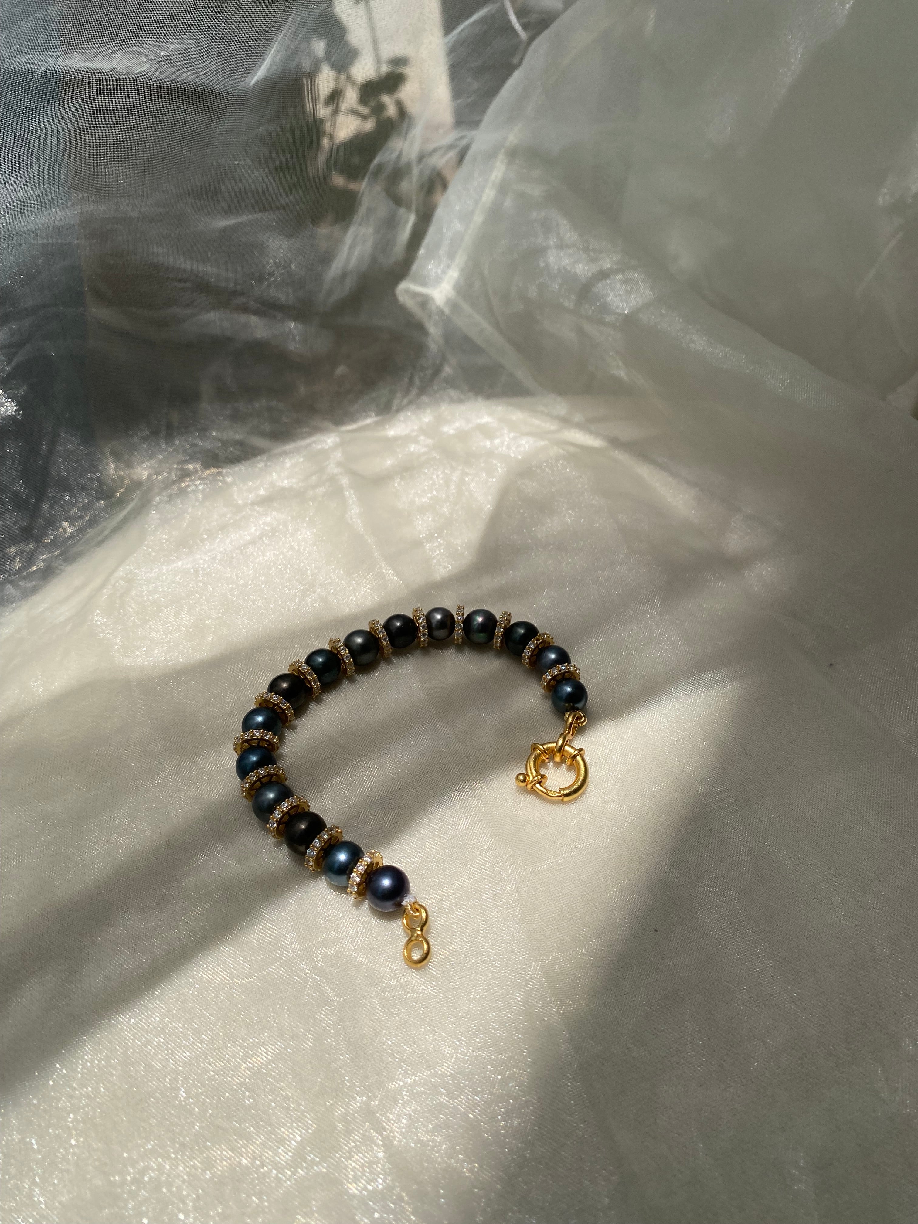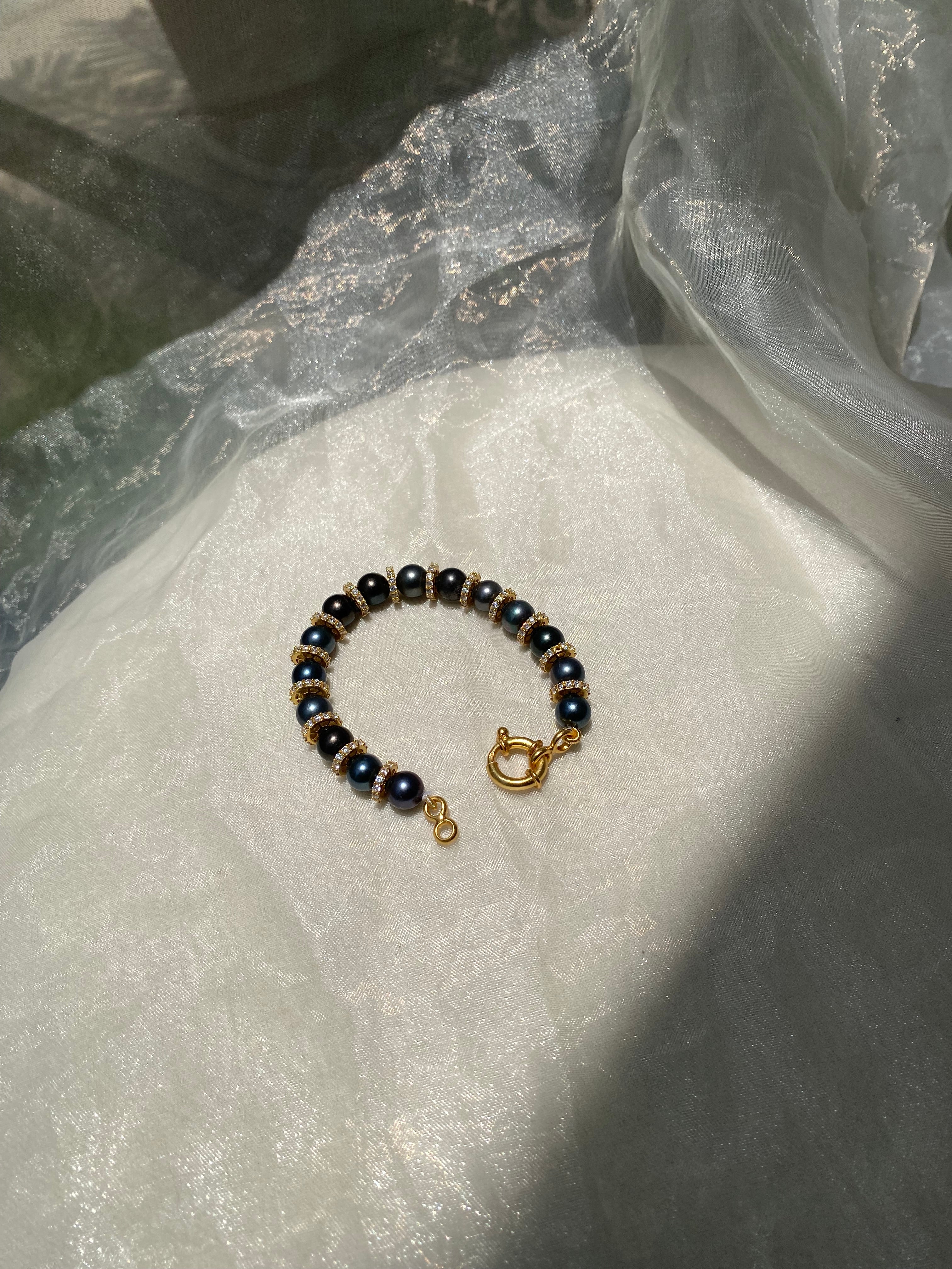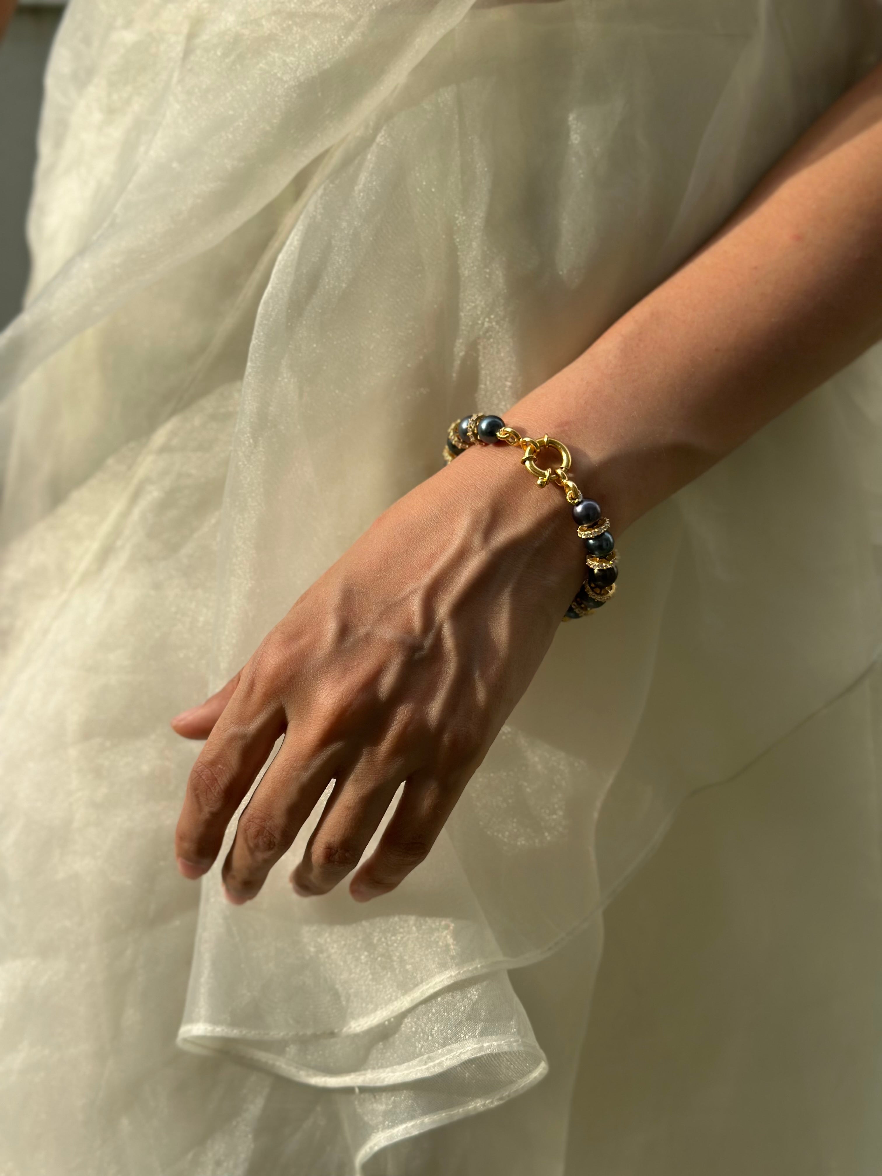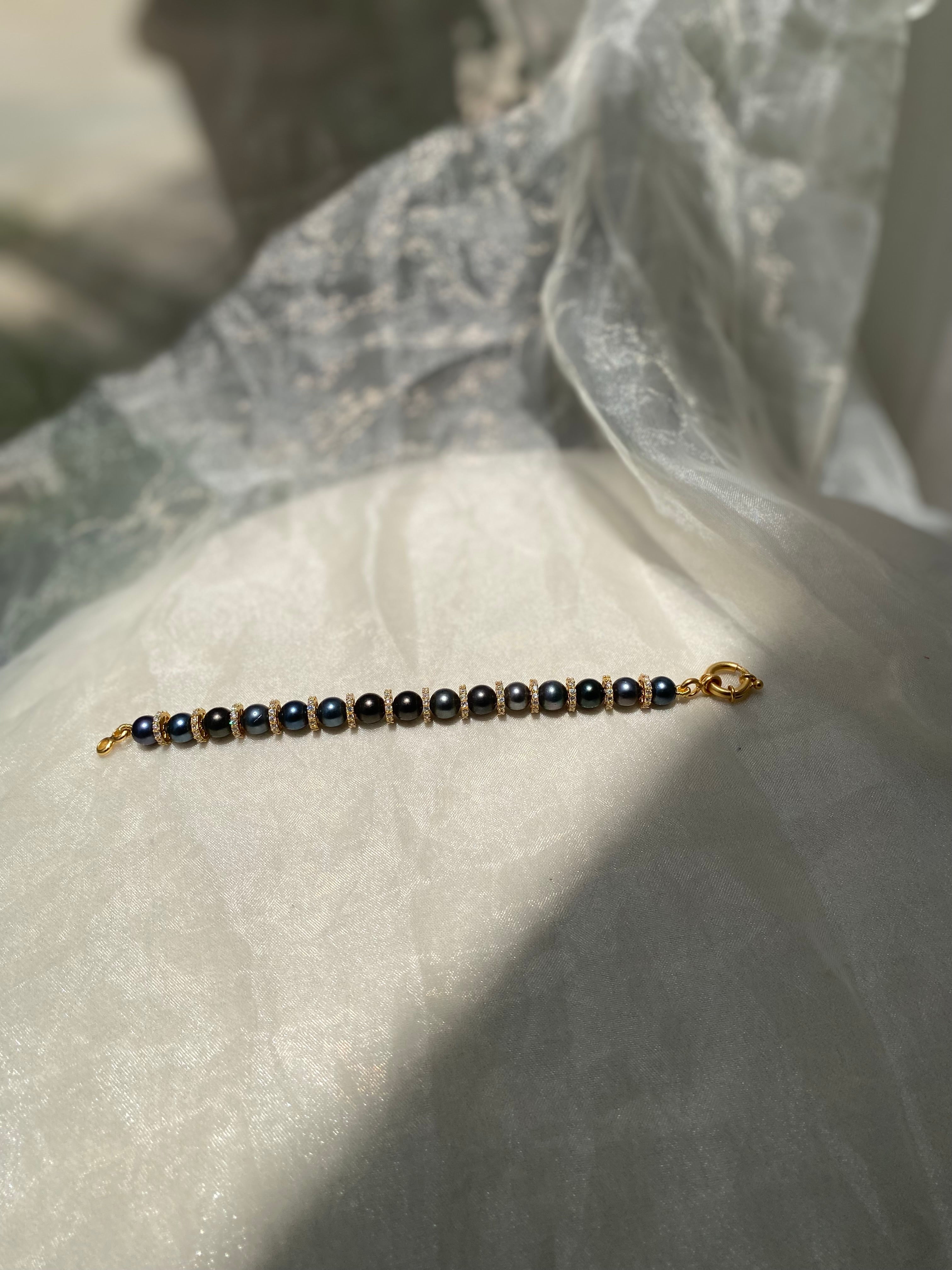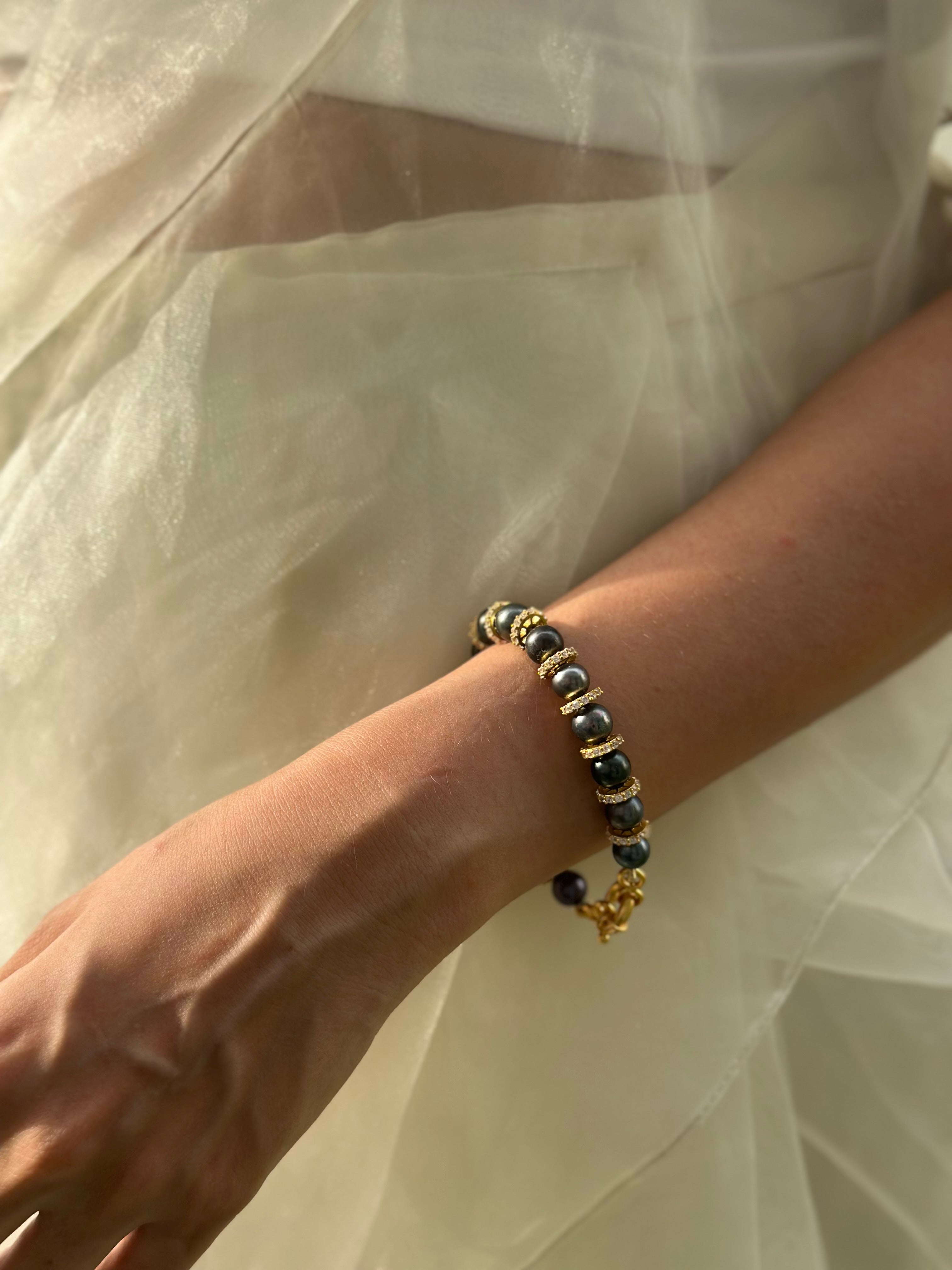 This stunning 7-inch bracelet is crafted from hallmarked 92.5 fine silver and finished with a soft gold plating for a timeless appeal. Featuring lustrous grey pearls paired with sparkling Swarovski CZ, the bracelet embodies quiet luxury and refined elegance.