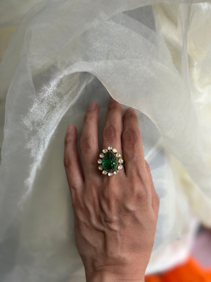Elevate your style with this exquisite 92.5 fine silver ring, gold plated and hallmarked for authenticity. Featuring a 2.5 cm motif adorned with Moissanite Polki and intricately carved green onyx, this adjustable ring effortlessly blends heritage craftsmanship with modern elegance.