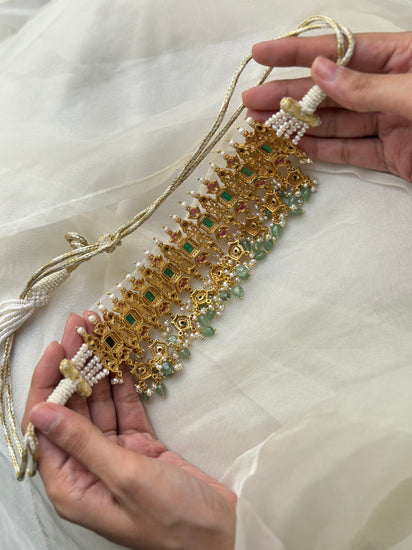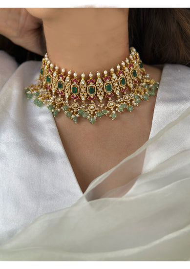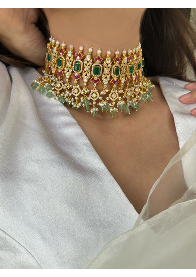 Gemstones: Green Onyx, Green Aventurine, Pink Cut Kundan, Natural Pearls, Mossanite, and Polkis
