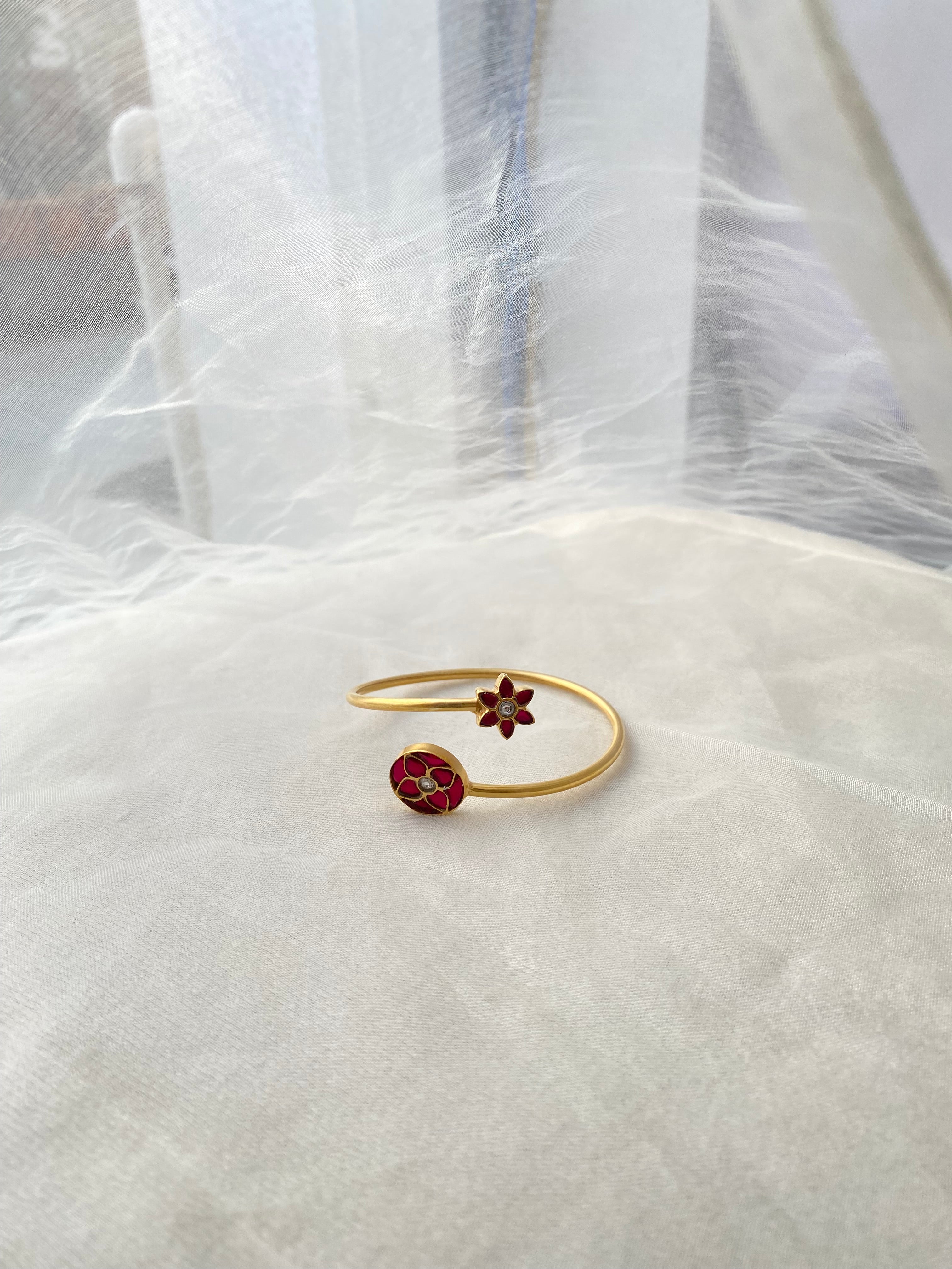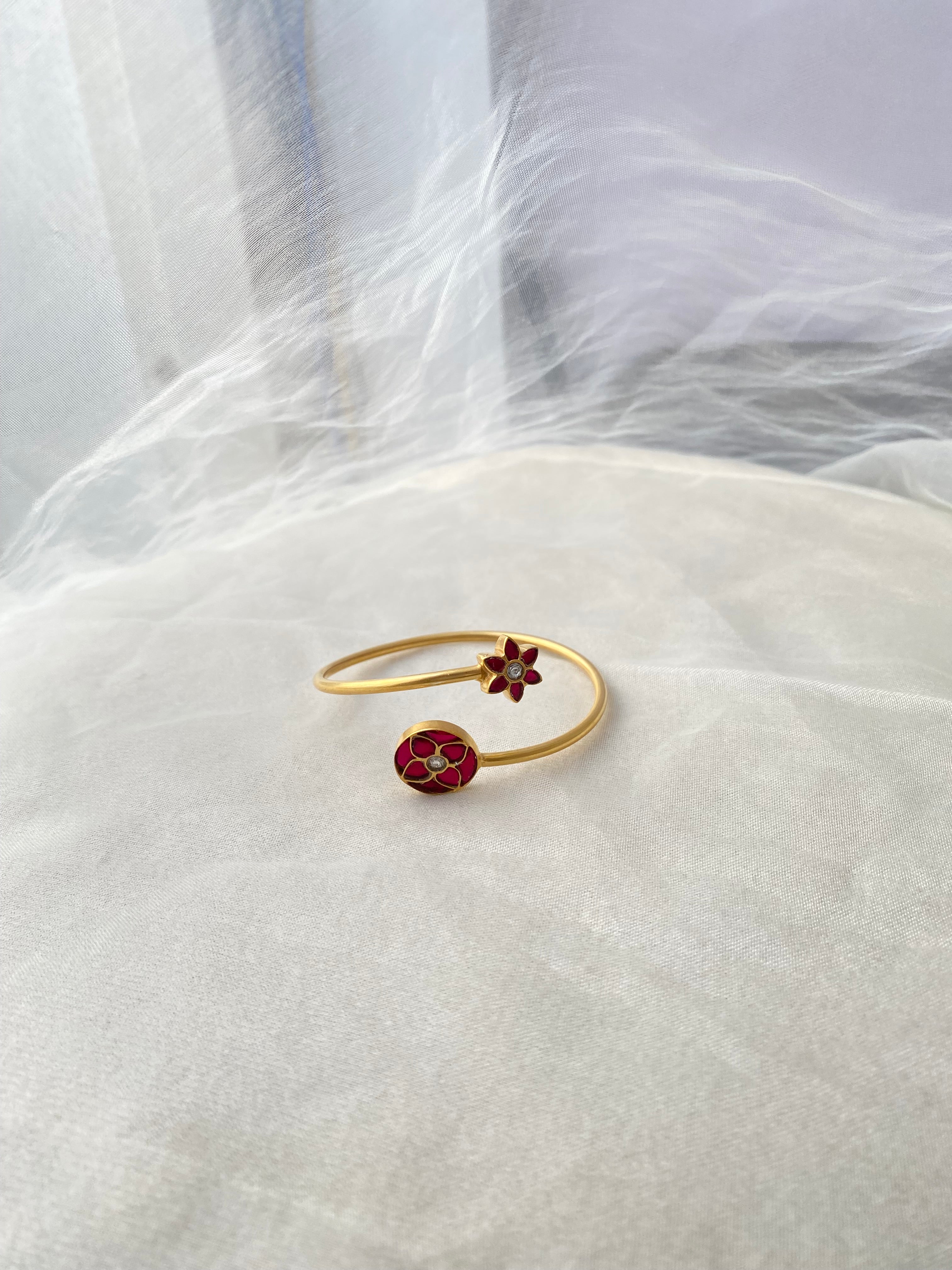 Grace your wrist with this exquisite 92.5 sterling silver handcuff, hallmarked for purity and finished in rich gold plating. The design is adorned with sparkling white kundan and detailed with delicate pink enamel artistry, bringing together royal tradition and modern refinement.