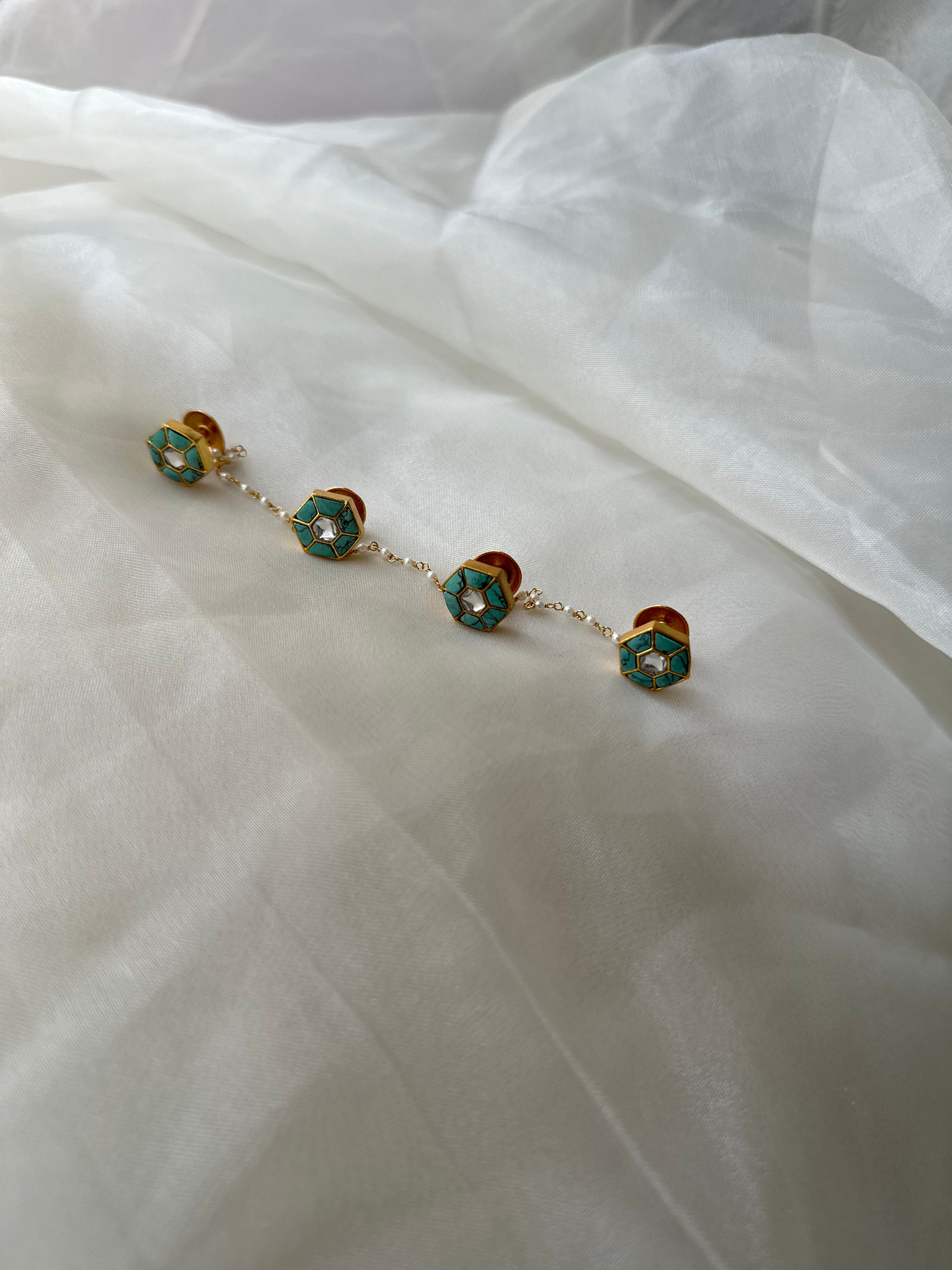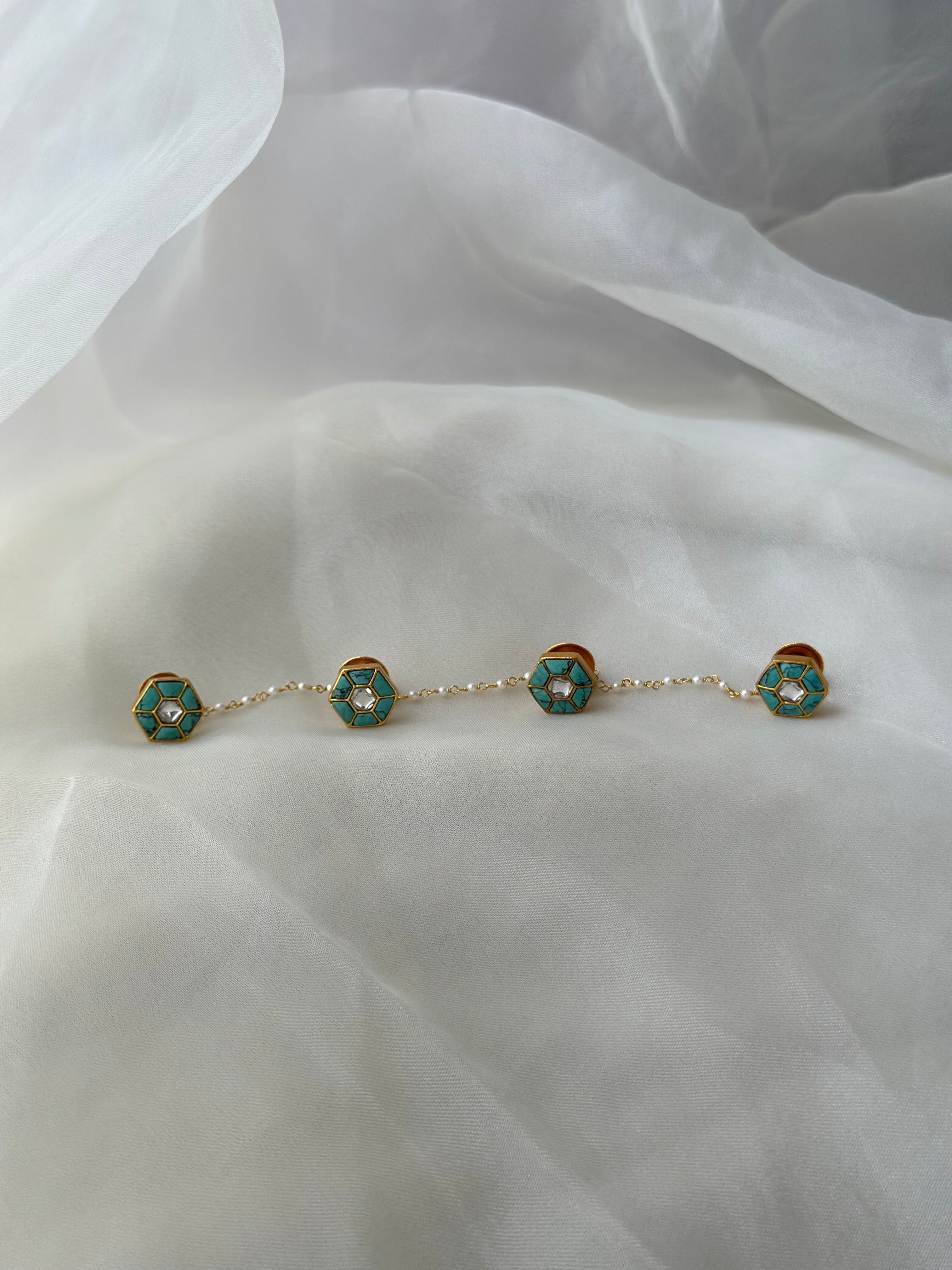 Handcrafted in hallmarked 92.5 fine silver and finished in luxurious gold plating, this kurta button chain is adorned with Kundan, turquoise stones, and freshwater pearls, offering a perfect blend of tradition and elegance. With motif sizes ranging from 10β11 mm and a 6 cm chain, this ready-to-ship piece brings graceful detail and royal charm to your festive or formal wear.
